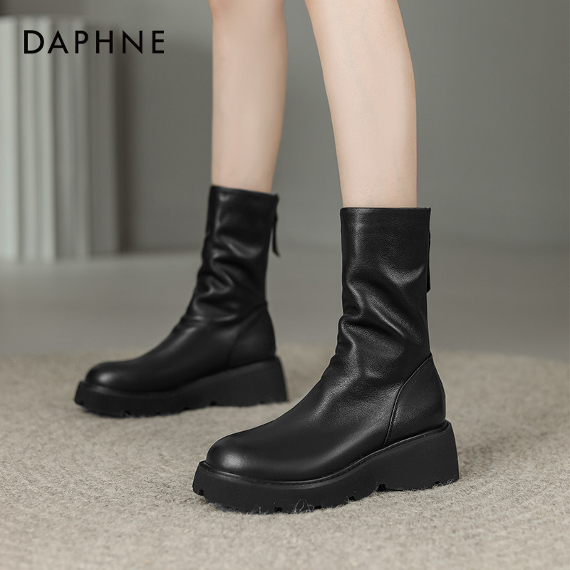 达芙妮厚底马丁靴女2026新款短靴春季靴子春款瘦瘦靴中筒坡跟皮靴
