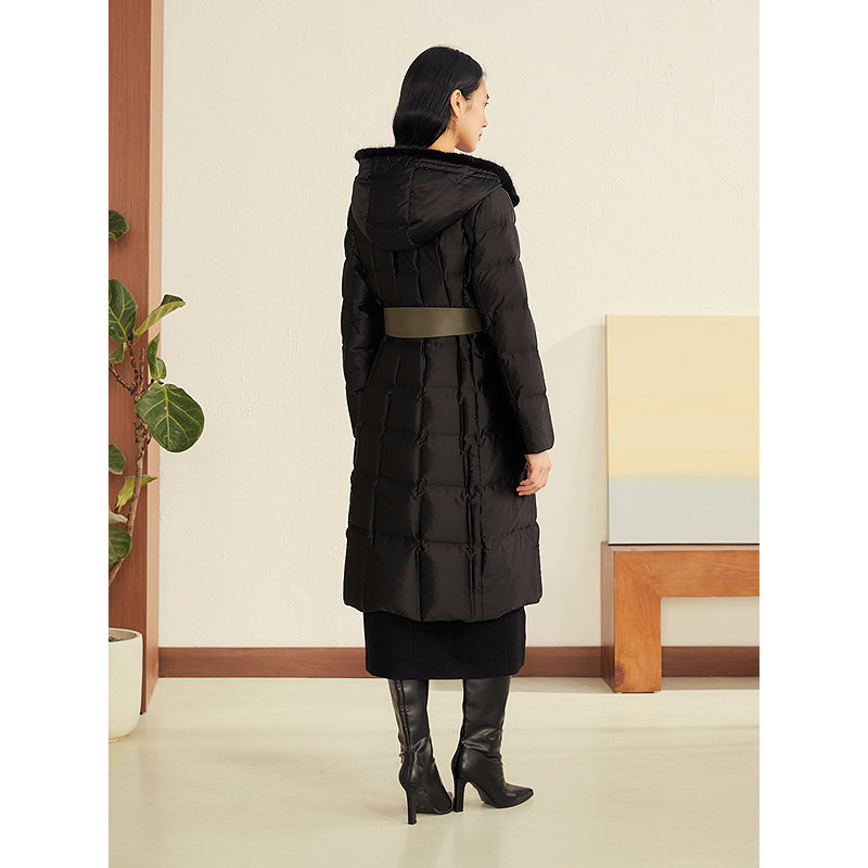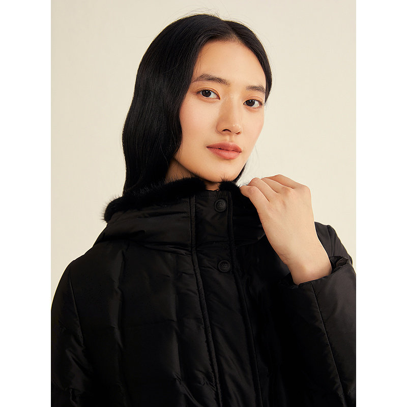 YINER音儿2025冬季新款高密防绒缎面水貂毛领连帽白鹅绒羽绒服