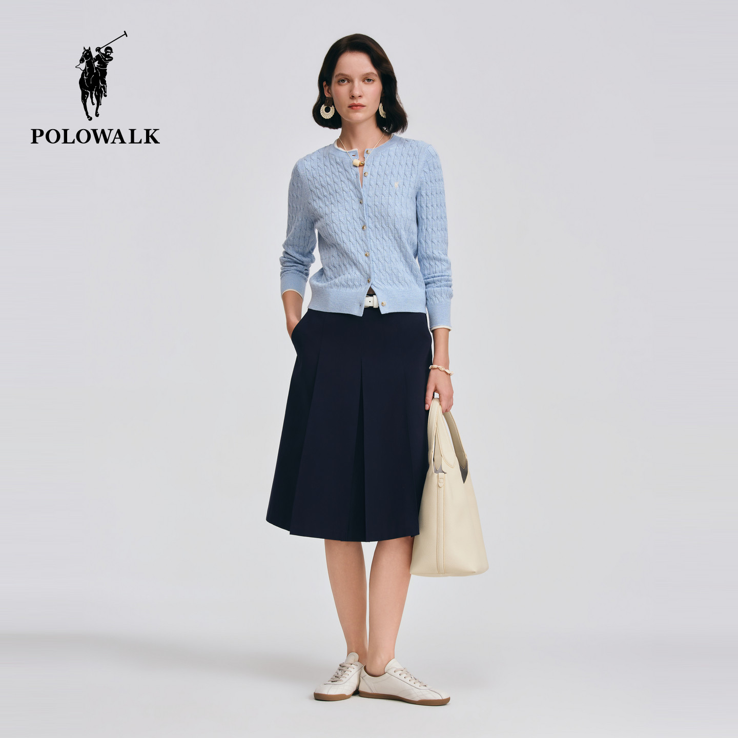 POLOWALK女士长袖针织衫2026春季新款圆领绞花修身针织开衫毛衣女
