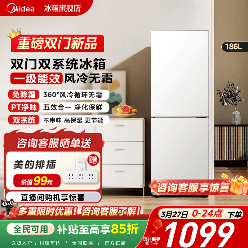美的196超薄双开两门小冰箱家用小户型租房一级节能省电风冷无霜
