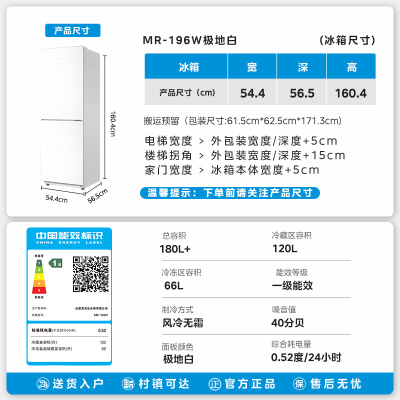 美的195/180+超薄双开两门家用小户型出租屋冰箱节能省电风冷无霜