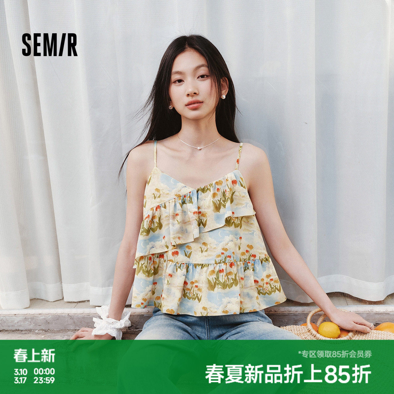 森马衬衫女短款上衣修身荷叶边碎花法式2025夏新款甜美吊带小衫