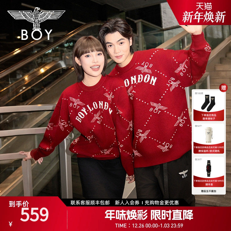 【红酒派对】BOYLONDON冬季新年情侣毛衣套头酒红色上衣N60906
