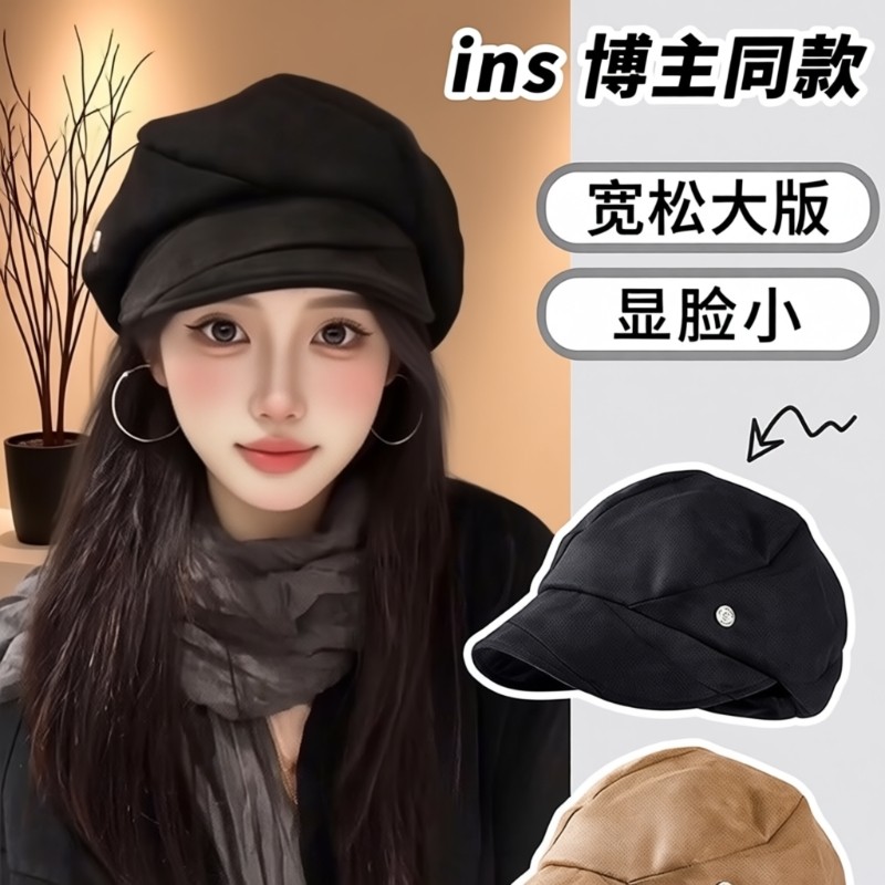 日系复古褶皱黑色贝雷帽女素颜百搭大头围画家帽显脸小报童帽子潮