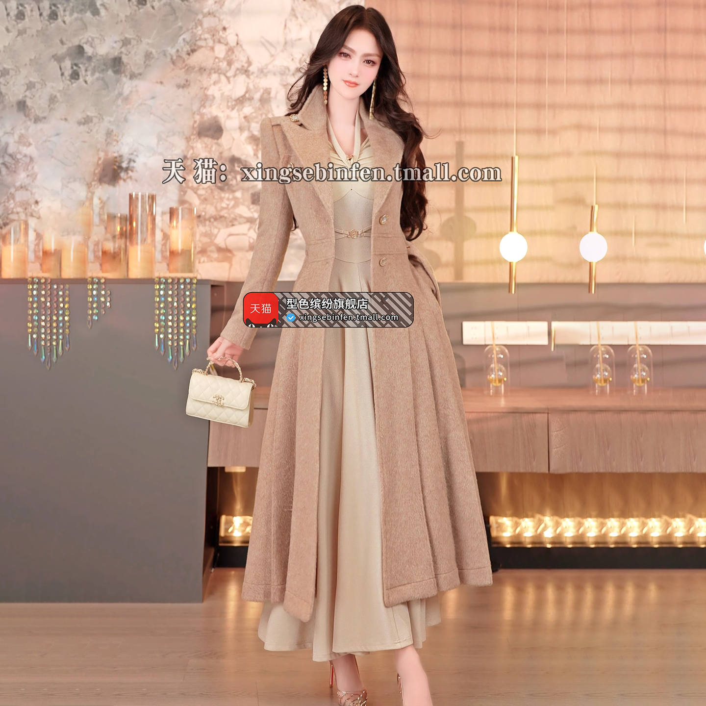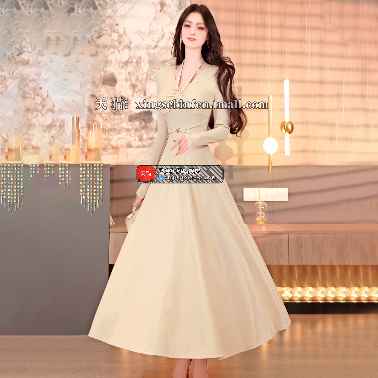 型色缤纷欧美小众挂脖V领褶皱连衣裙新款气质大摆过膝长裙