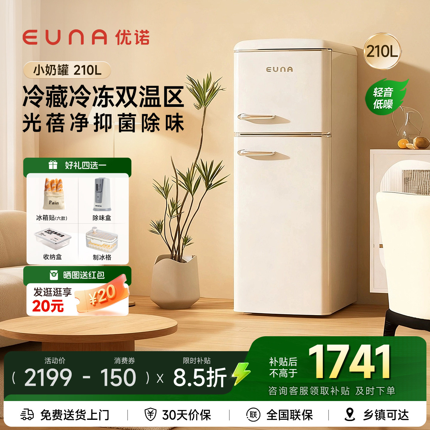 EUNA/优诺小奶罐BCD-210R复古冰箱美式时尚冷藏冷冻家用租房小型