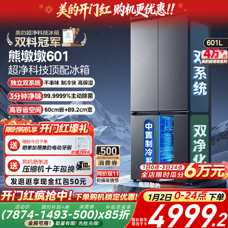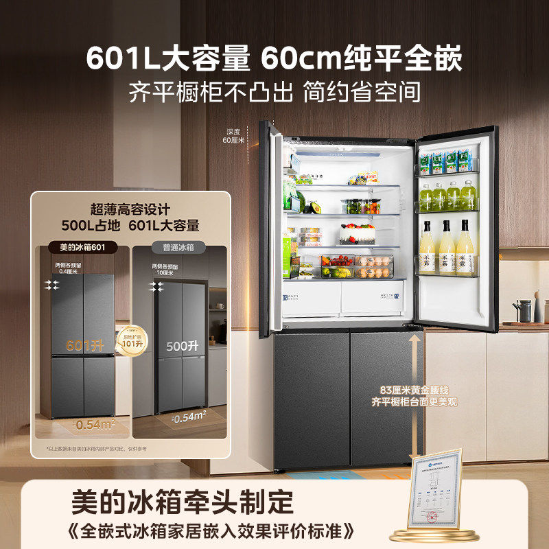 美的熊墩墩601双系统超薄零嵌入式十字四门双开门家用大容量冰箱