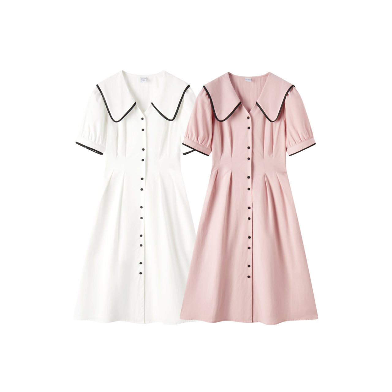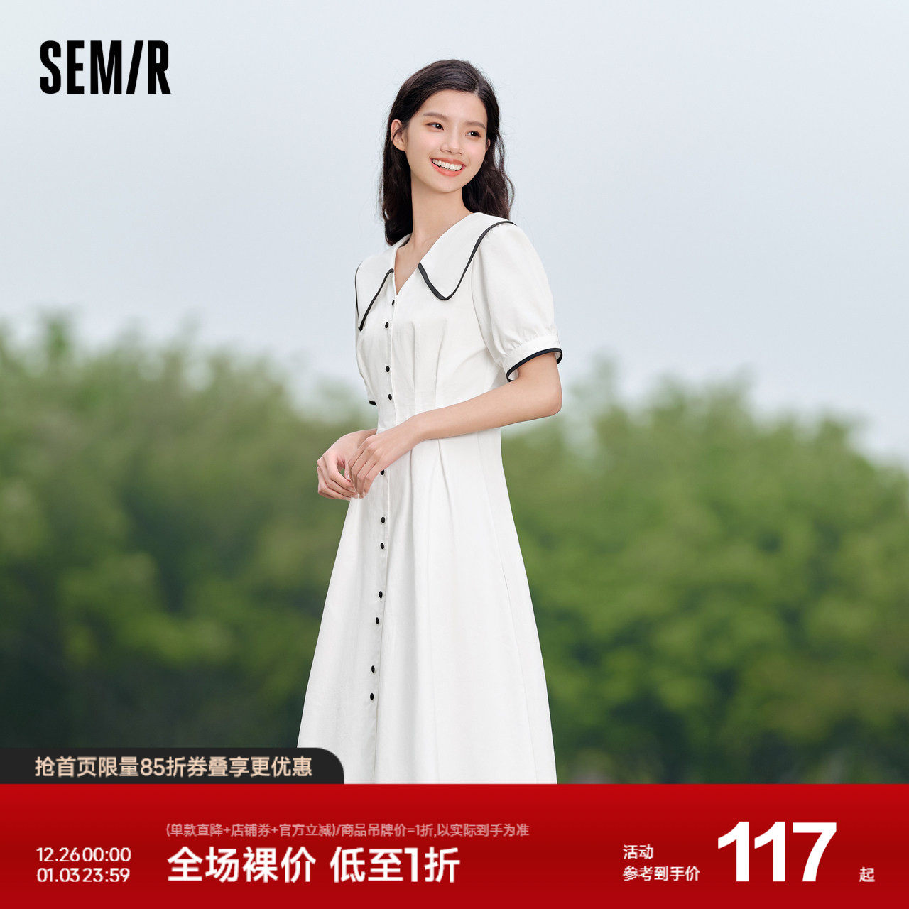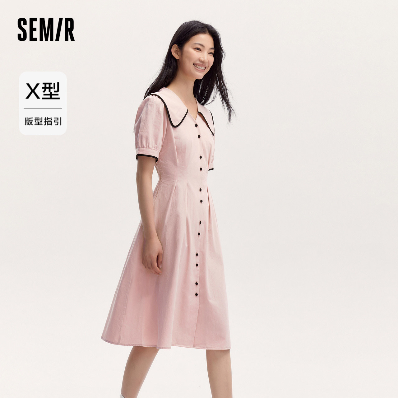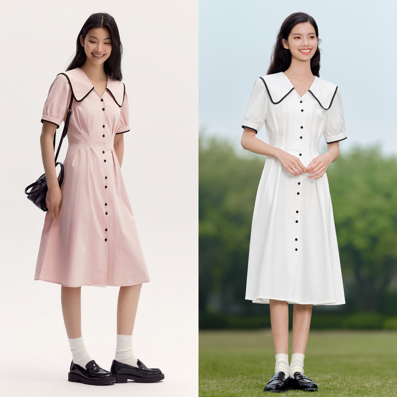森马连衣裙女纯棉泡泡袖初恋裙2024新款夏撞色大翻领中长裙学院风