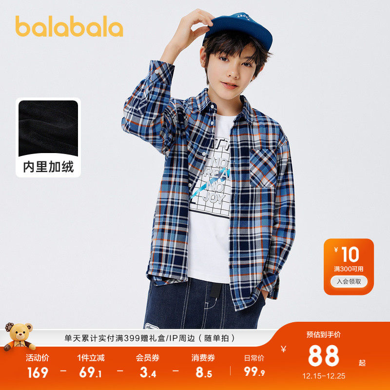 巴拉巴拉童装男童衬衫长袖加绒中大童格子印花衬衣洋气上衣潮休闲