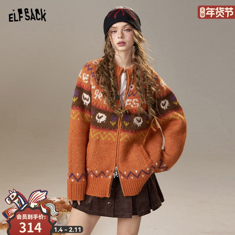 妖精的口袋费尔岛小羊提花新年毛衣女2025秋冬新款复古橘色厚外套