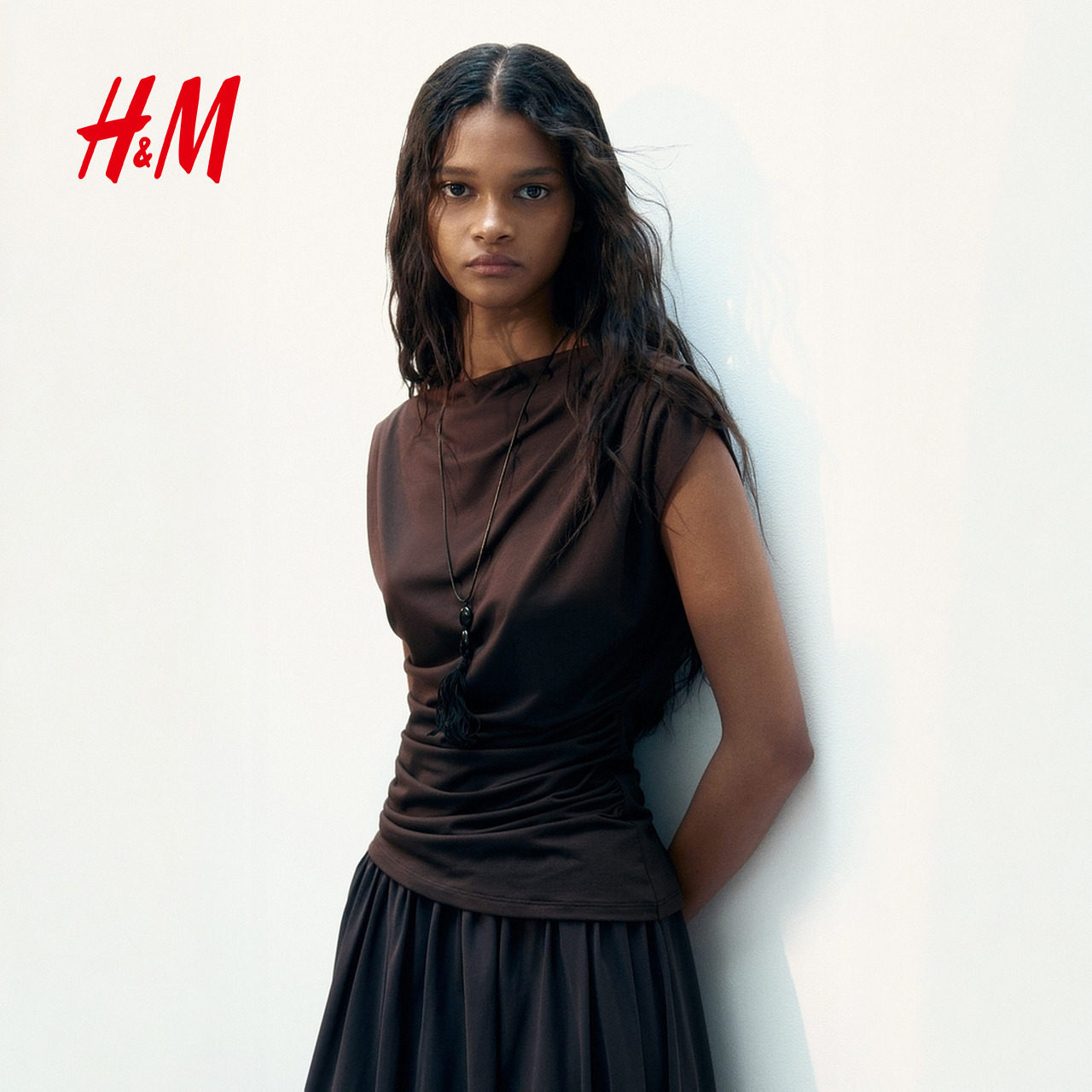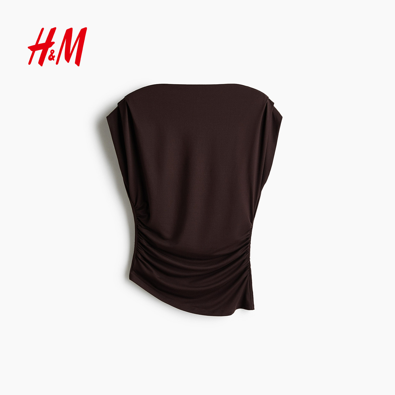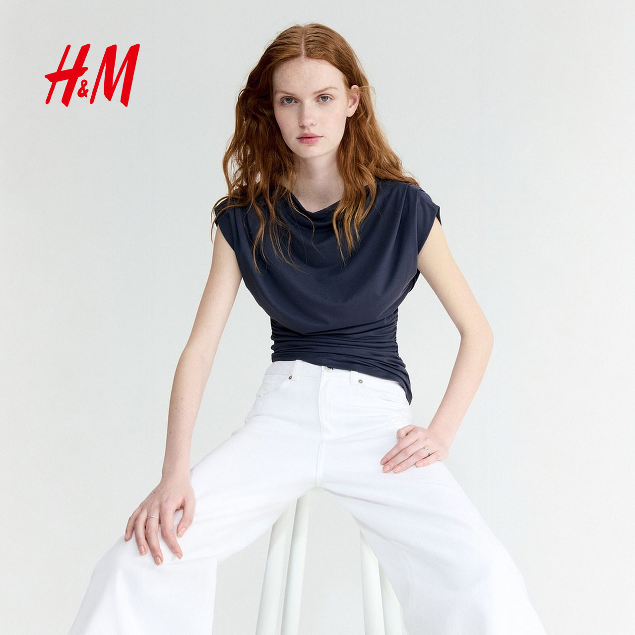 HM女装T恤2026春季新款简约修身休闲一字领垂褶上衣短袖1314284