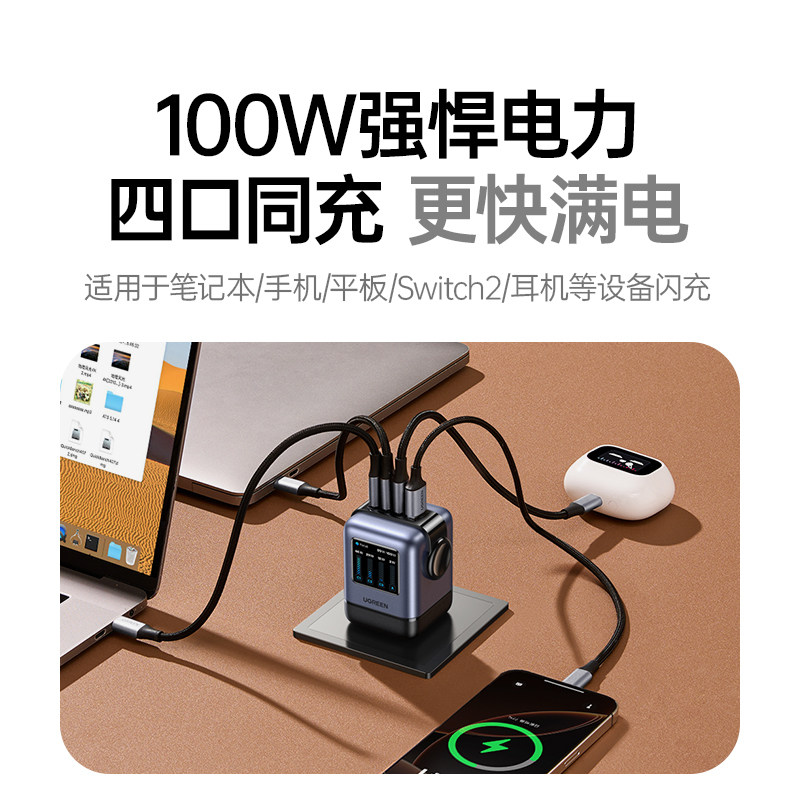绿联Q湃屏显机器人100W氮化镓充电器PD快充头适用苹果iPhone17pro小米华为联想笔记本电脑手机桌搭桌面充电站