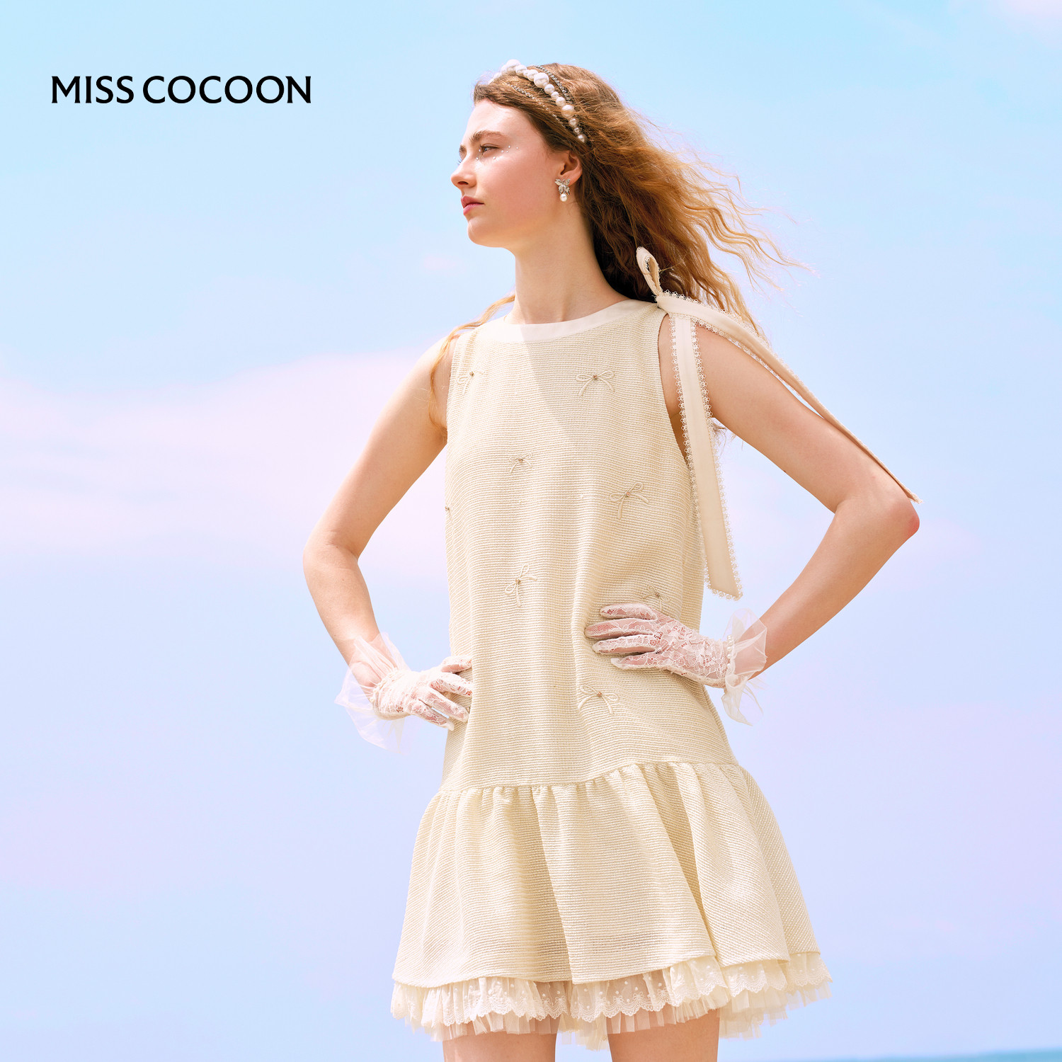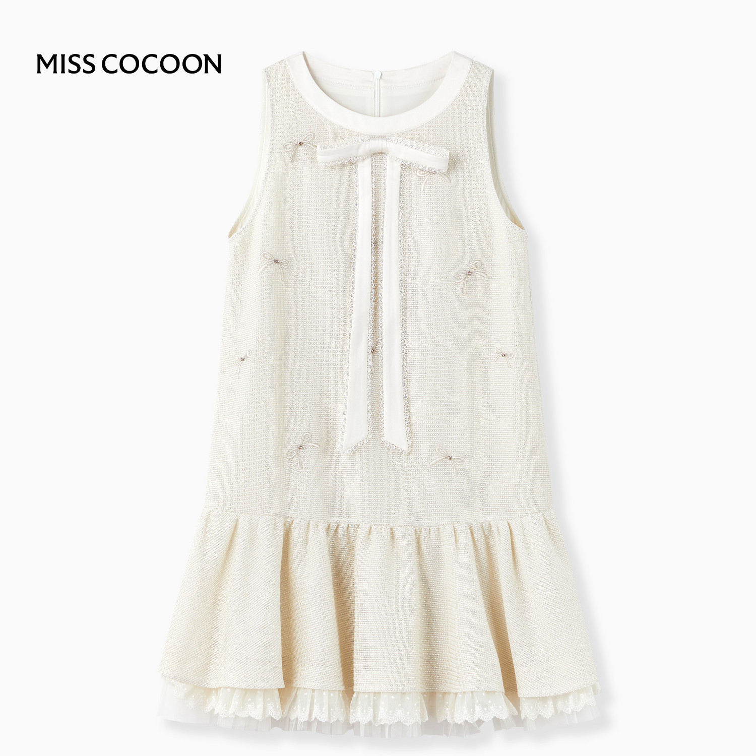 可可尼cocoon小香风连衣裙女2025秋季新款蝴蝶结刺绣蕾丝花边裙子