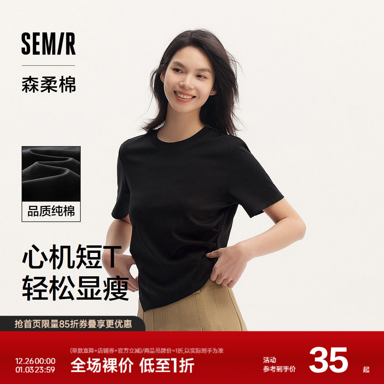 森柔棉|森马短袖T恤女短款纯色小心机显瘦夏气质纯棉开叉上衣百搭