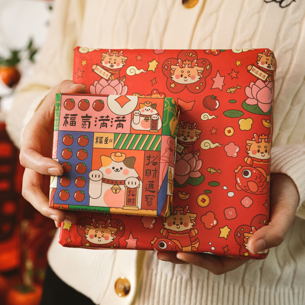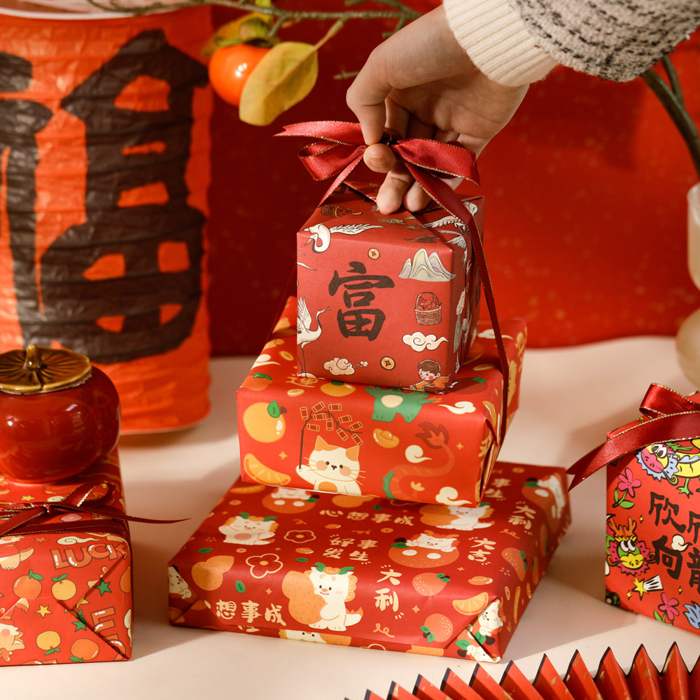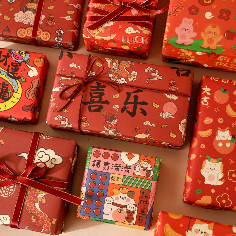 新年礼物包装纸高级感马年春节年会包糖果礼盒礼品纸大尺寸礼品盒中国风复古牛皮纸儿童元旦红色礼物纸加丝带