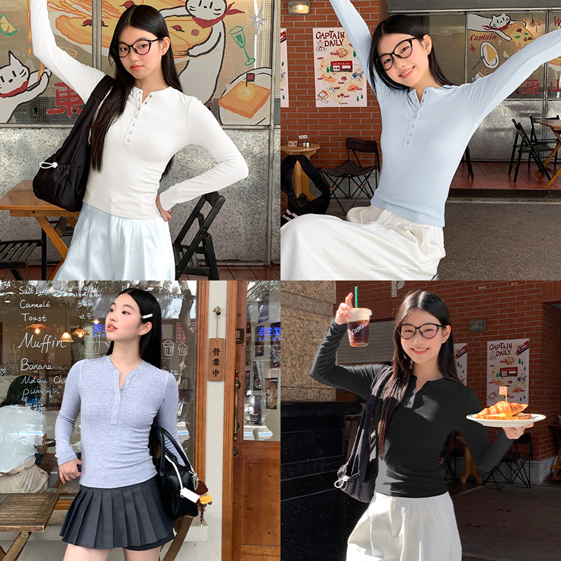蕉下亨利衫女长袖T恤v领秋冬修身保暖低领打底衫半开领白色上衣