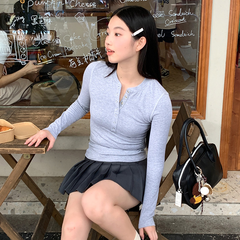三福打底衫女2025新款秋季简约纯色收腰V领修身休闲长袖上衣女装