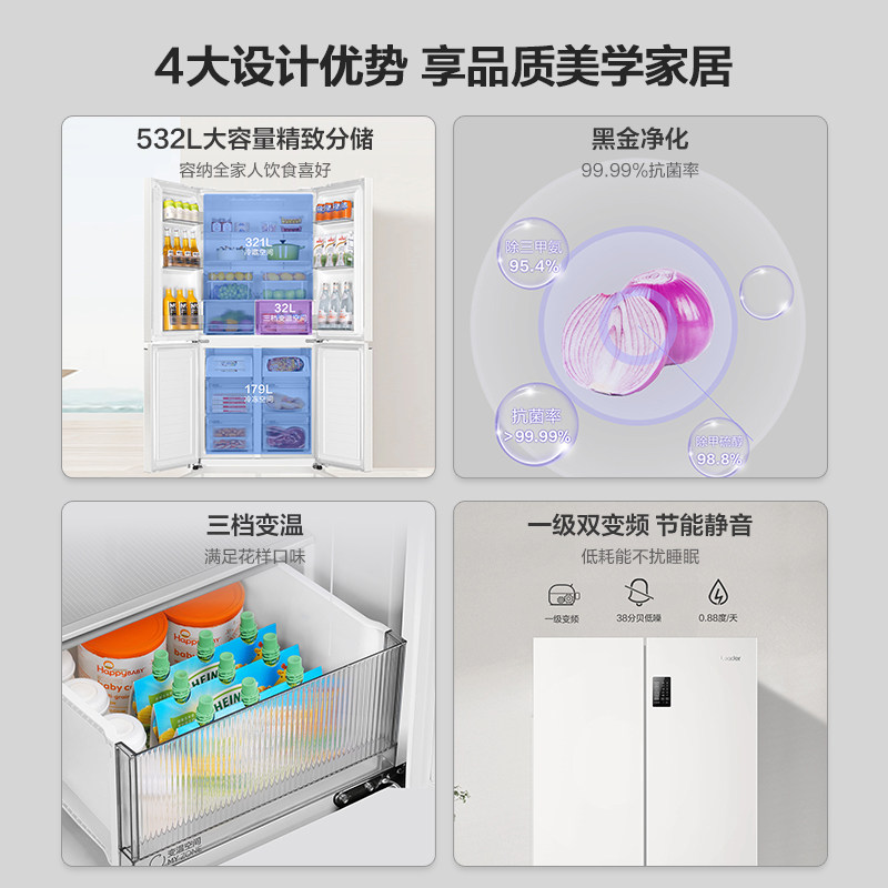 换新补贴海尔出品统帅532L十字对开四门无霜一级超薄家用电冰箱