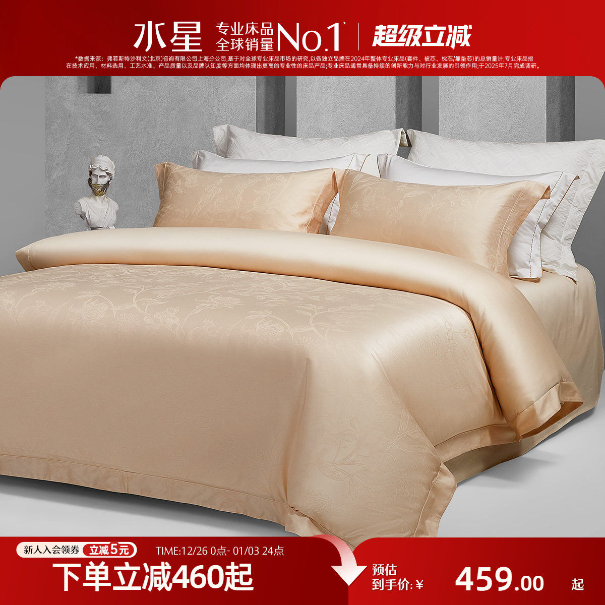 水星家纺60支长绒棉四件套提花套件全棉被套床单简约轻奢高端床品