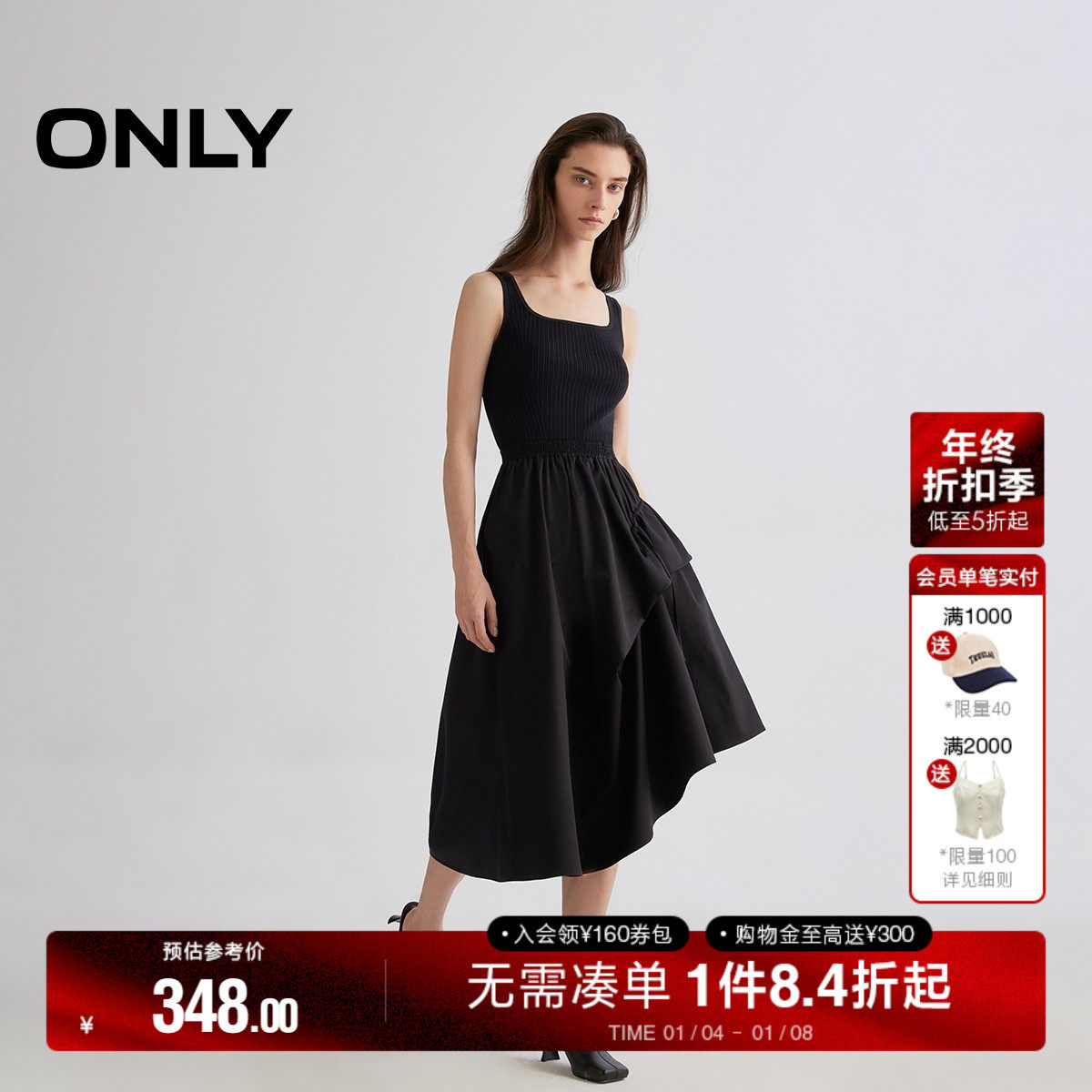 ONLY2025夏季新款法式方领舒适亲肤拼接不规则黑色中长款连衣裙女