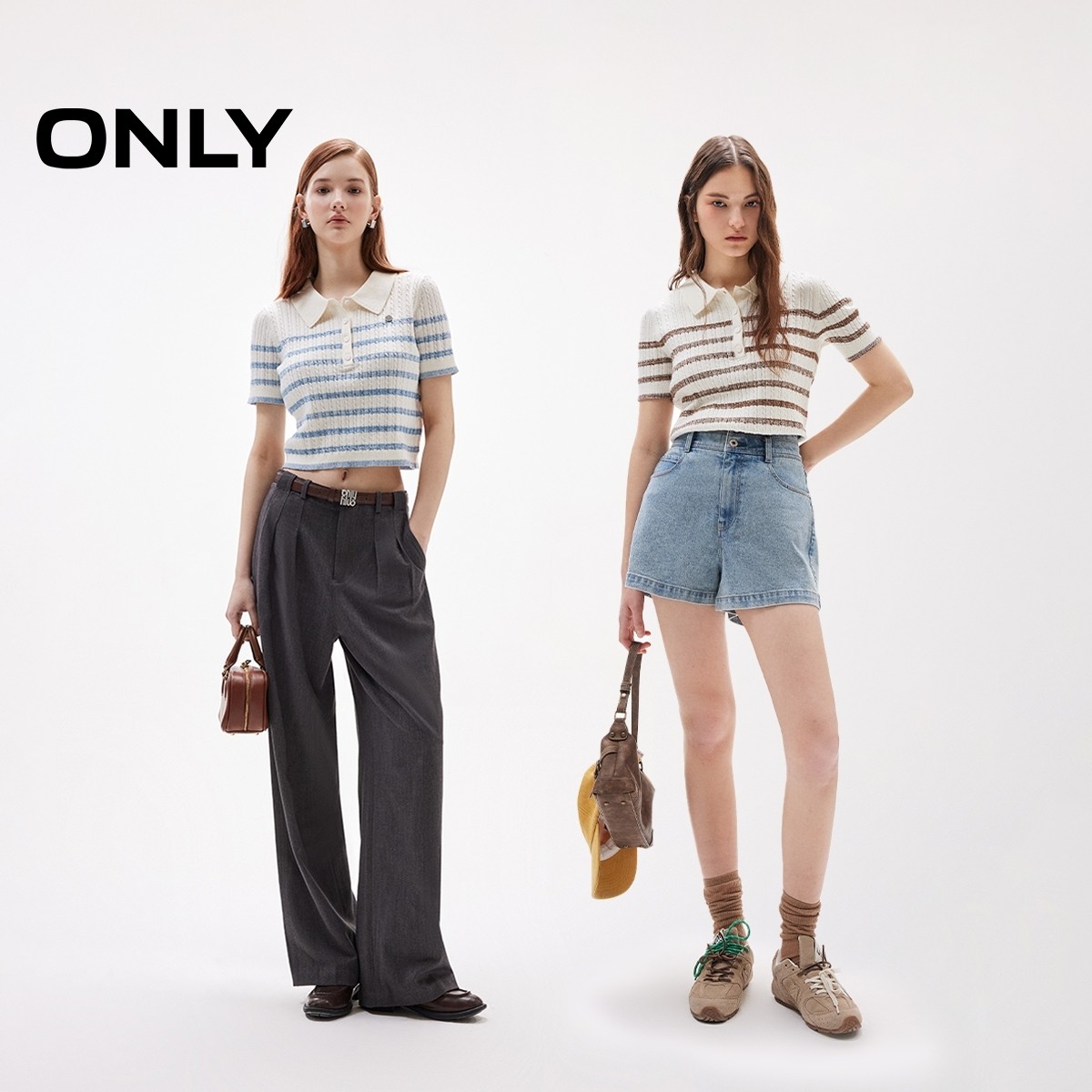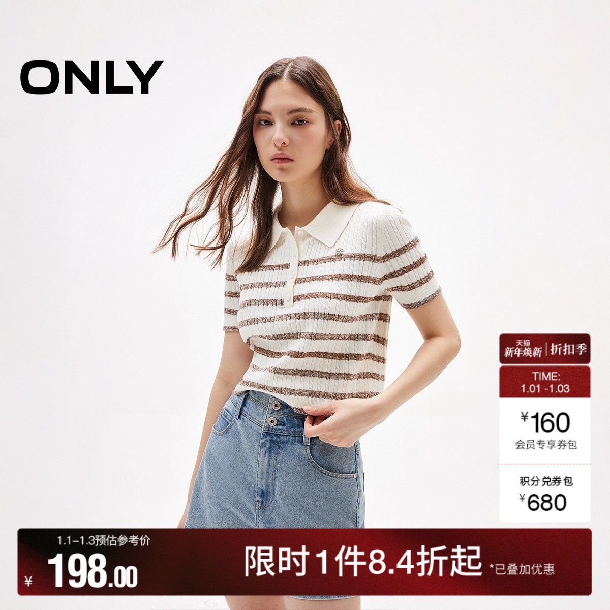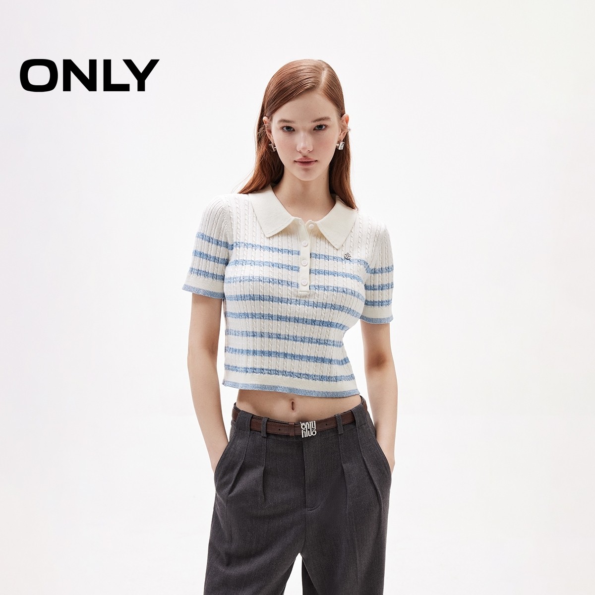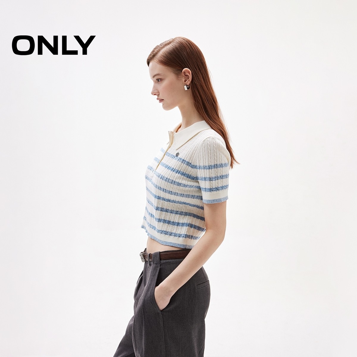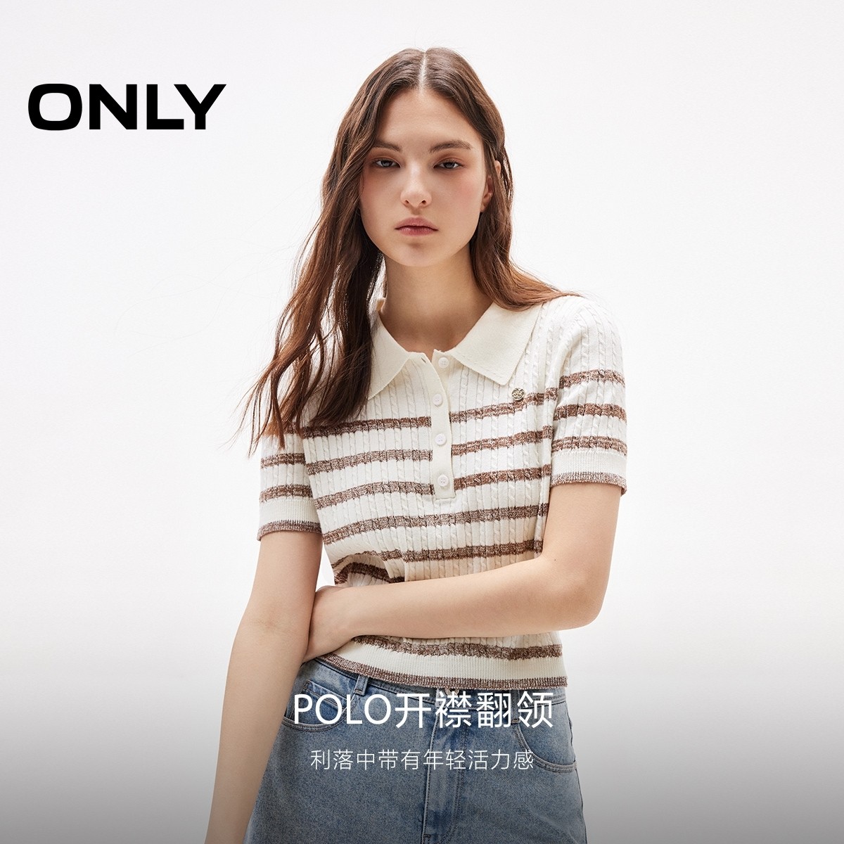 ONLY2025夏季新款学院风舒适POLO领经典条纹正肩短款短袖针织衫女