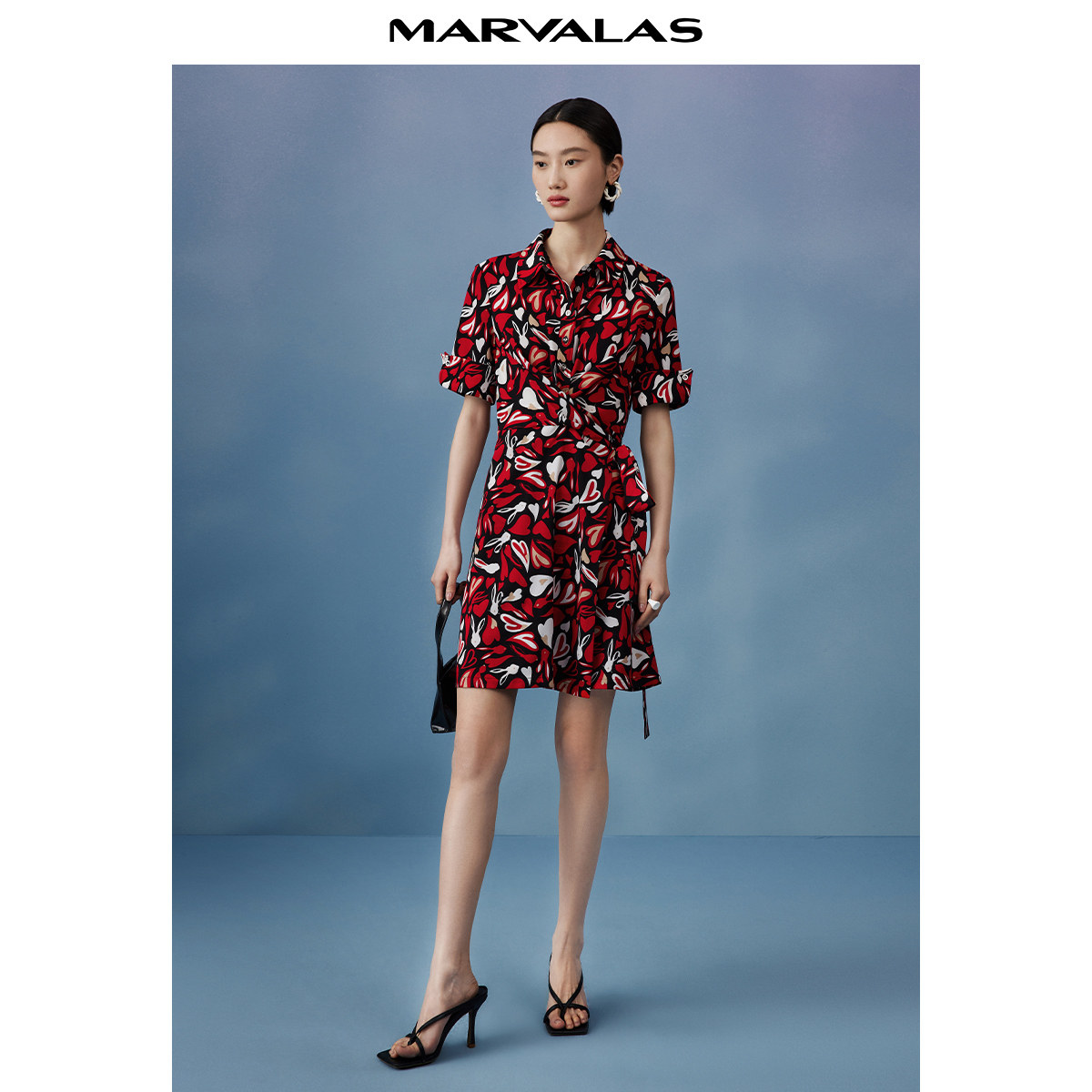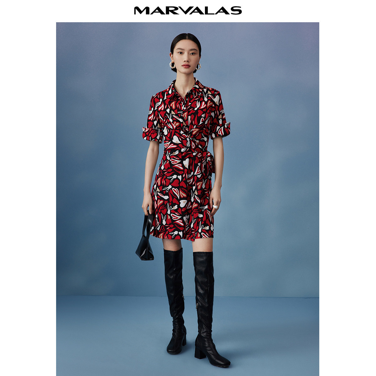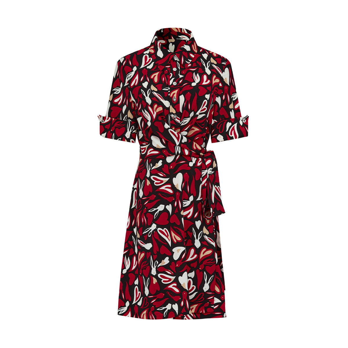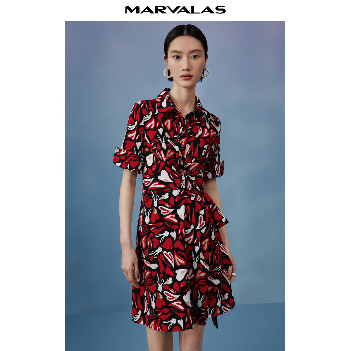 曼德诗复古衬衫领连衣裙2024夏秋新款短袖收腰兔子心形印花雪纺裙