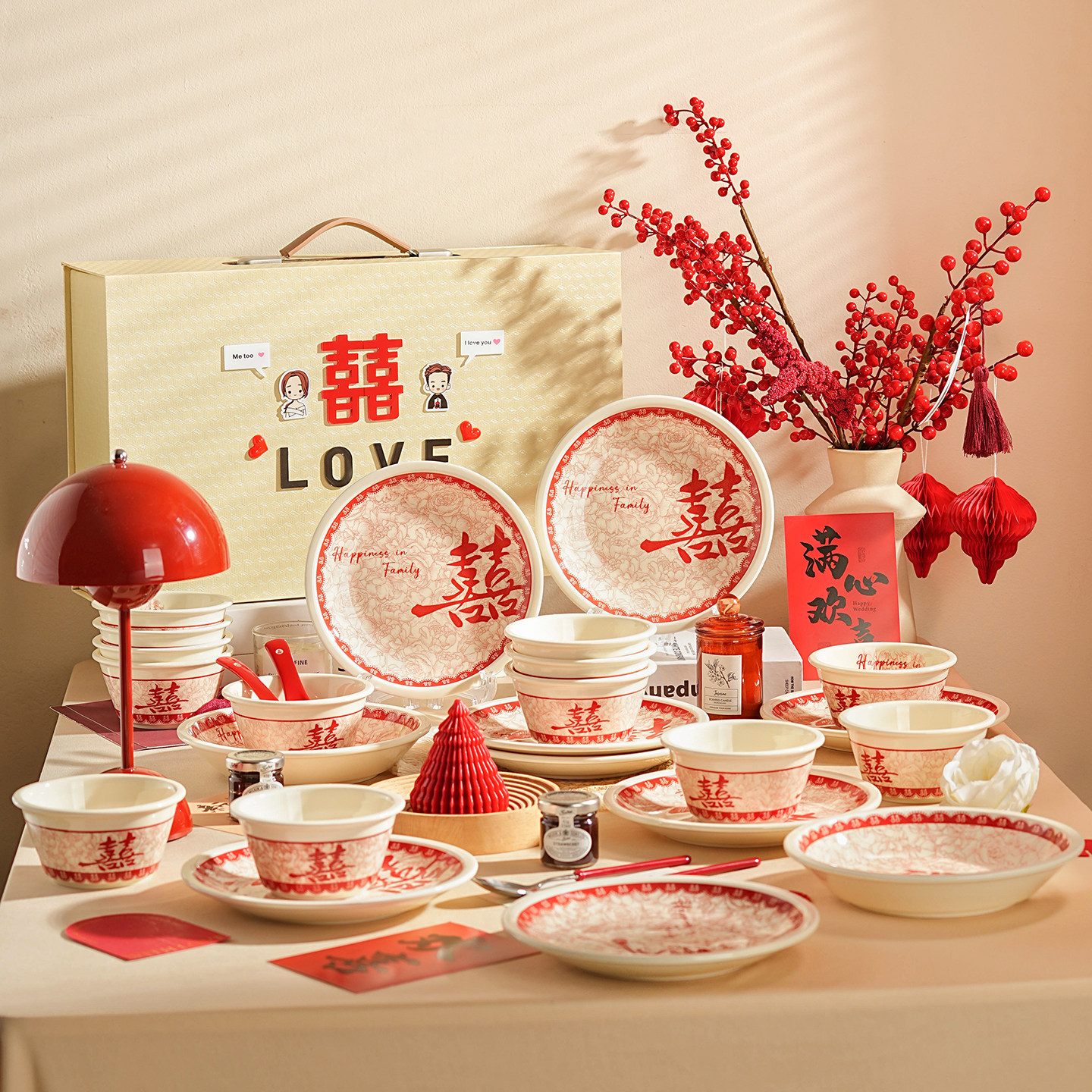 高档碗碟餐具陶瓷新婚礼物送新娘红色碗盘筷套装乔迁新居结婚礼盒