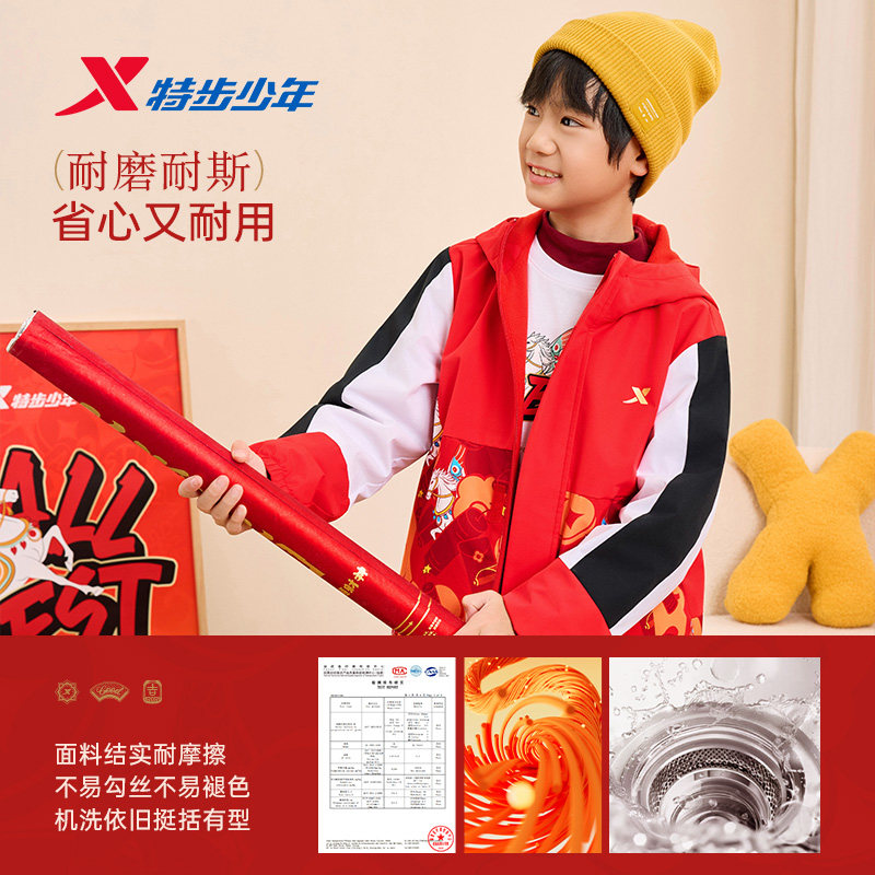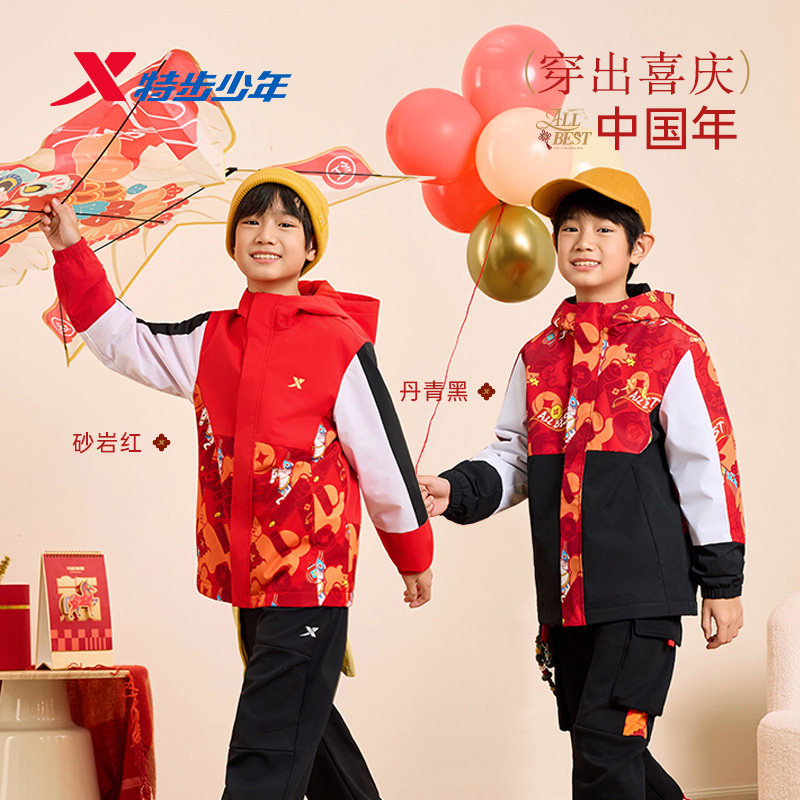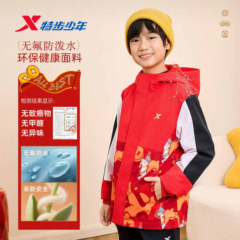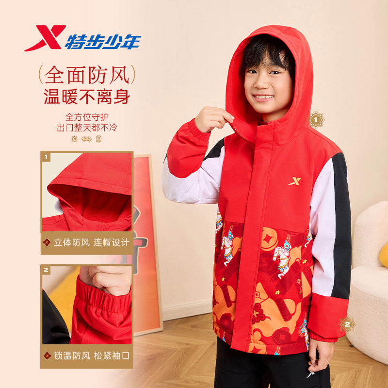 特步童装秋冬新款男童防风保暖风衣儿童运动女童亲肤耐磨连帽外套