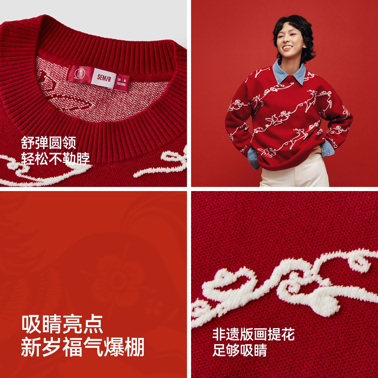 森马张仁华非遗联名毛衣女春季oversize提花红色落肩新年小众衣服