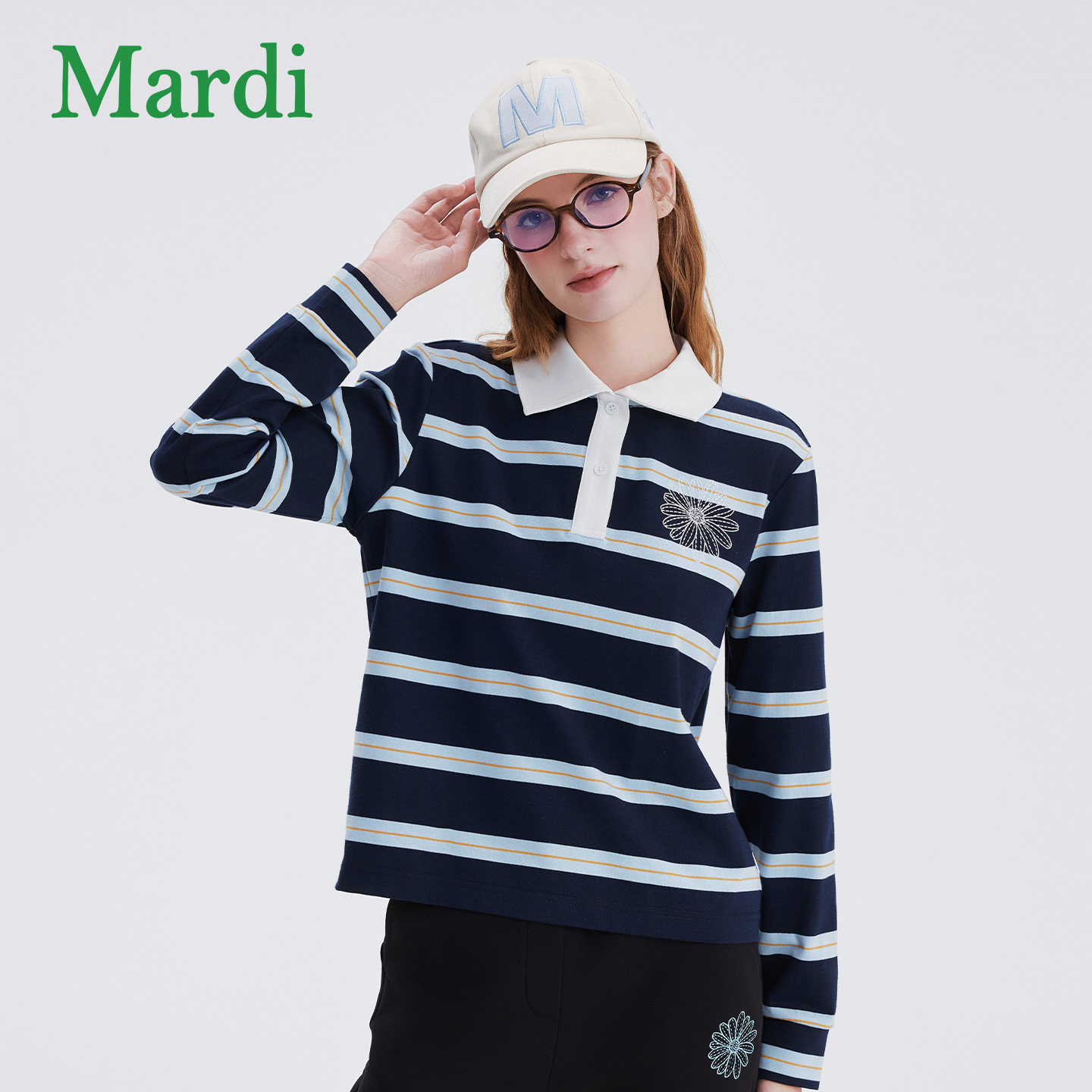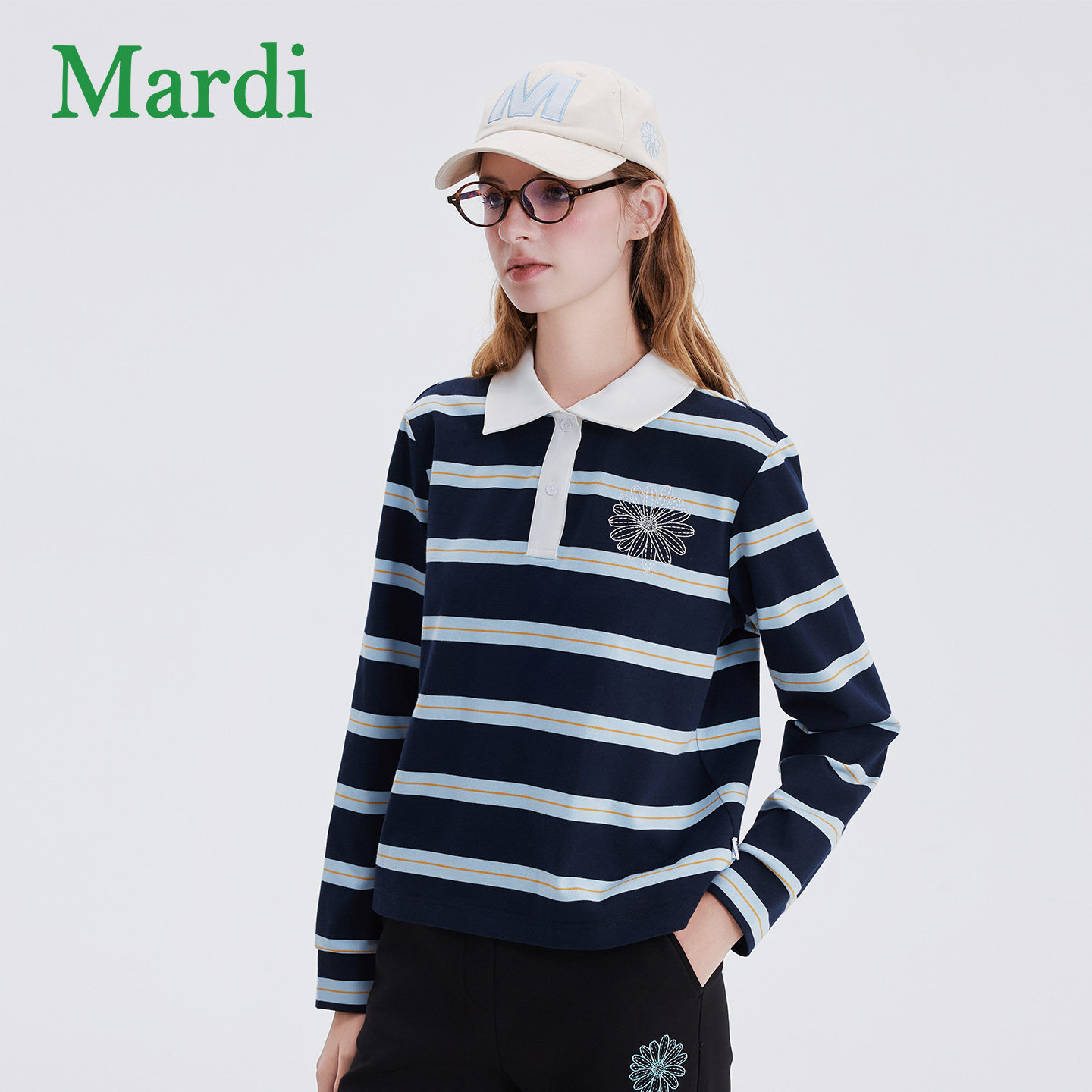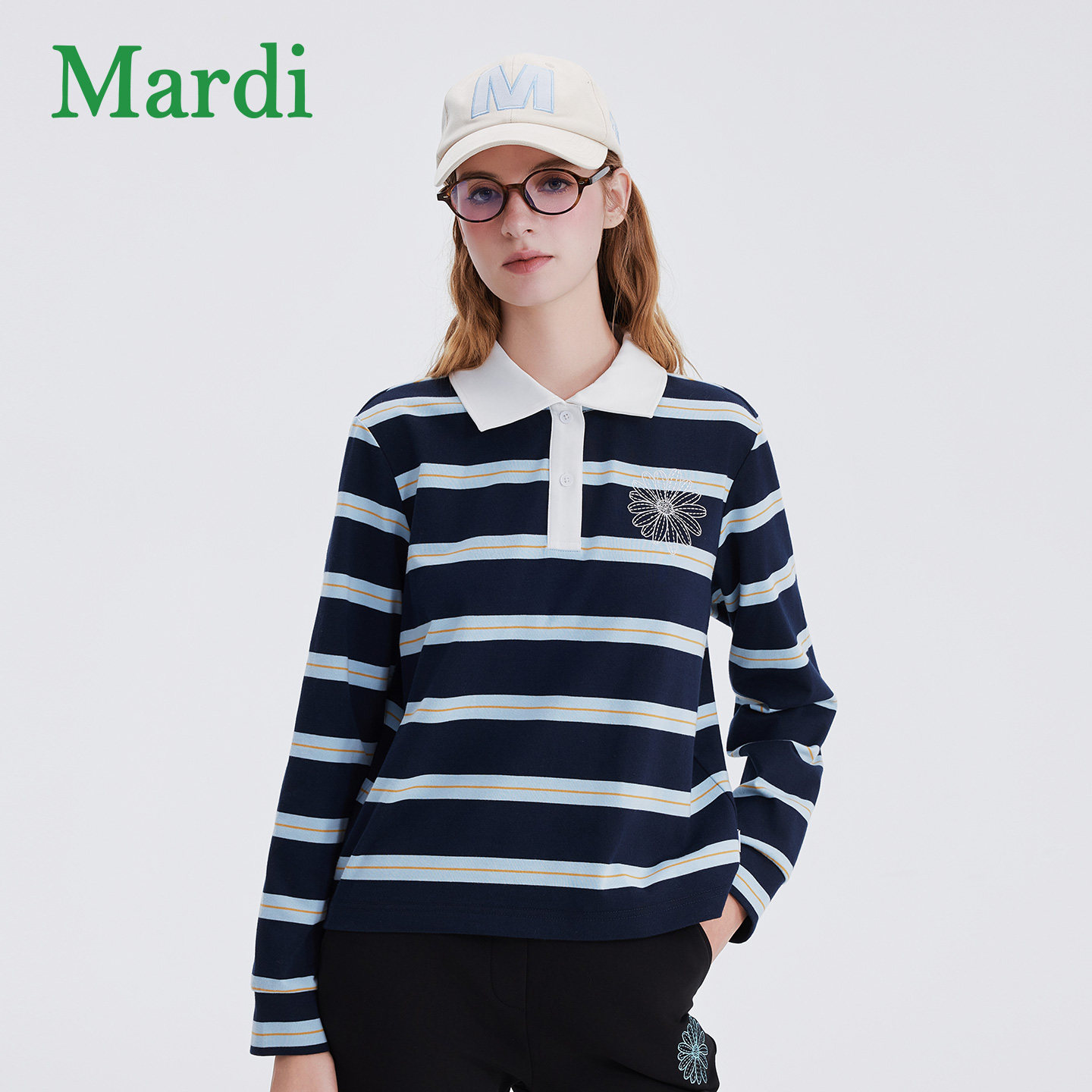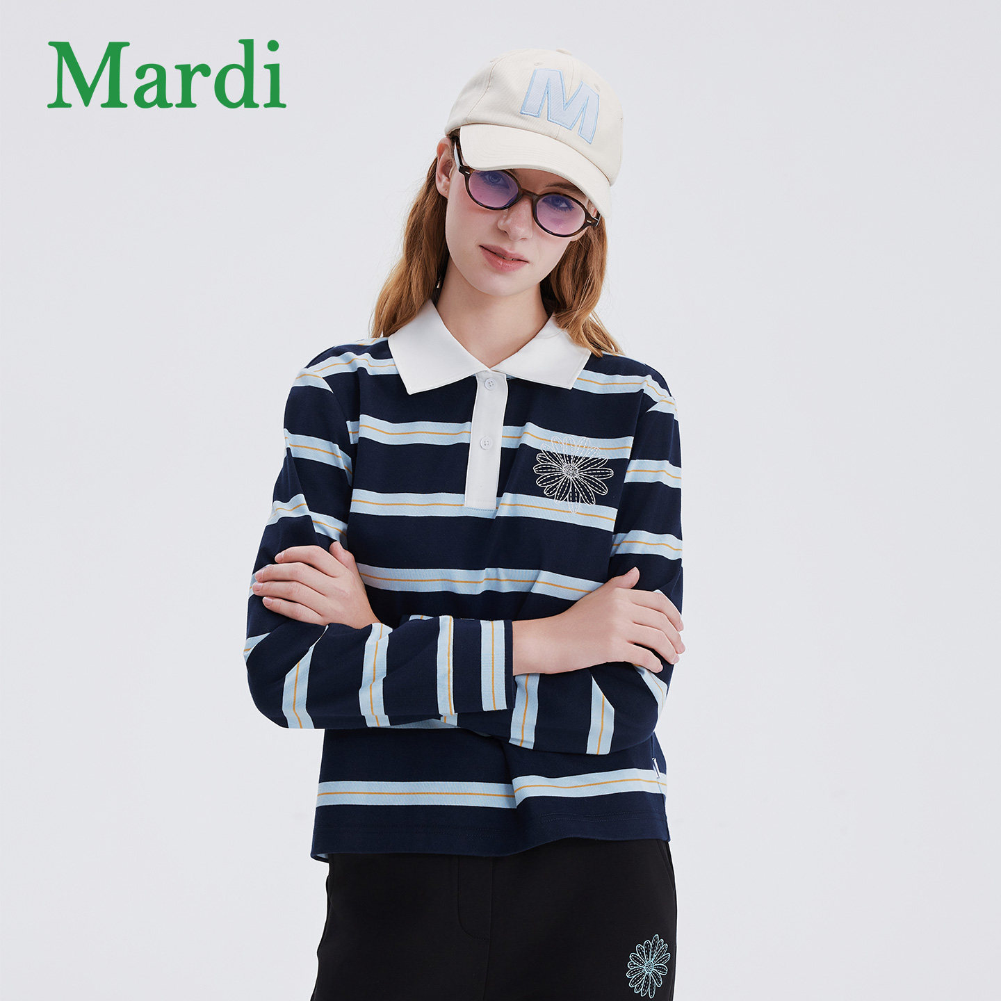 MARDI官方正品2026春季小雏菊条纹POLO衫长袖女休闲风翻领T恤上衣