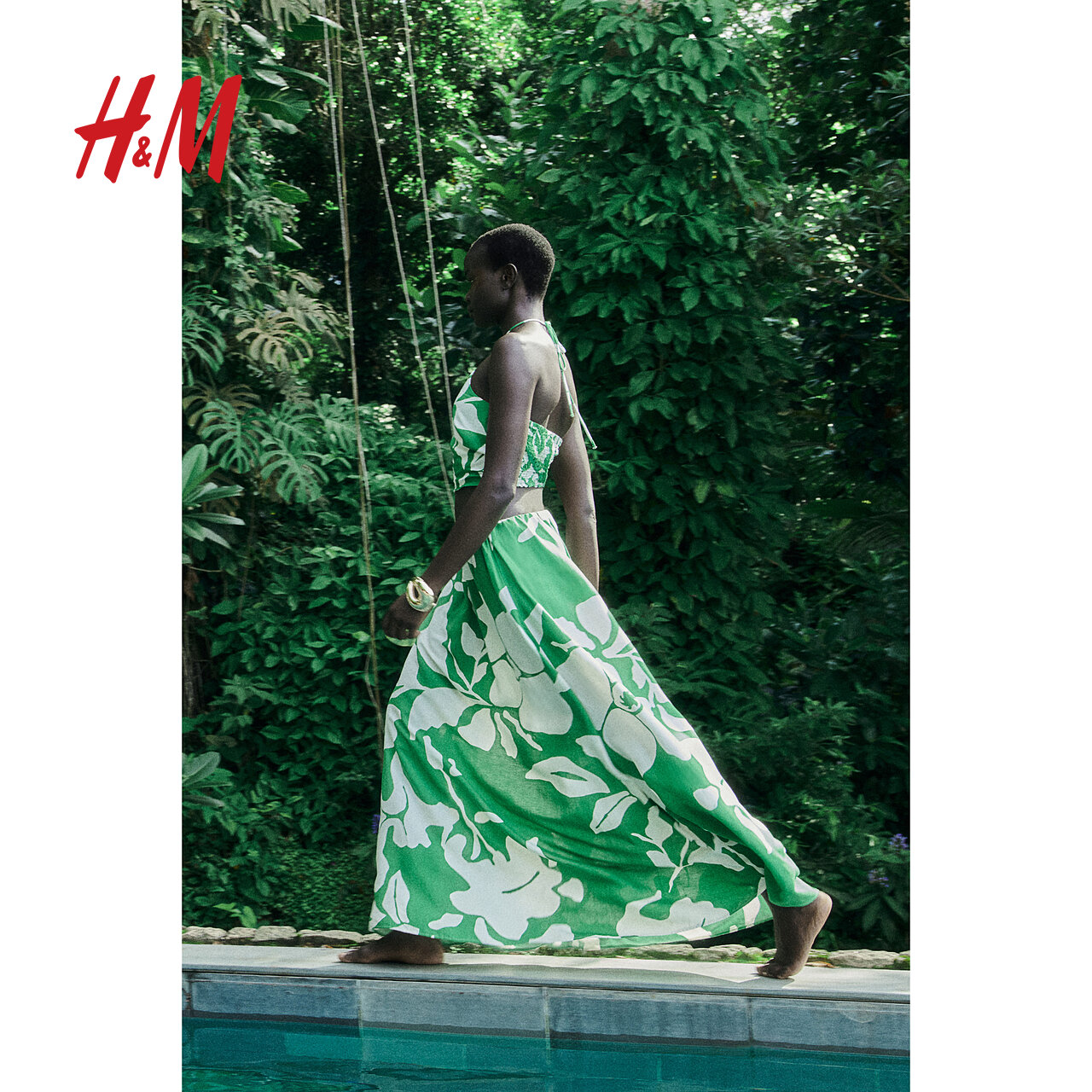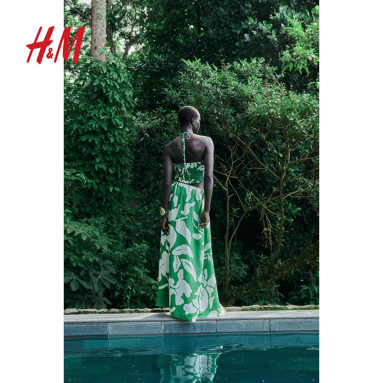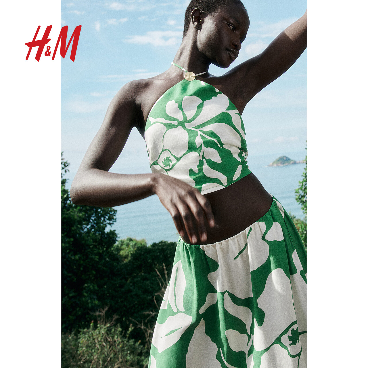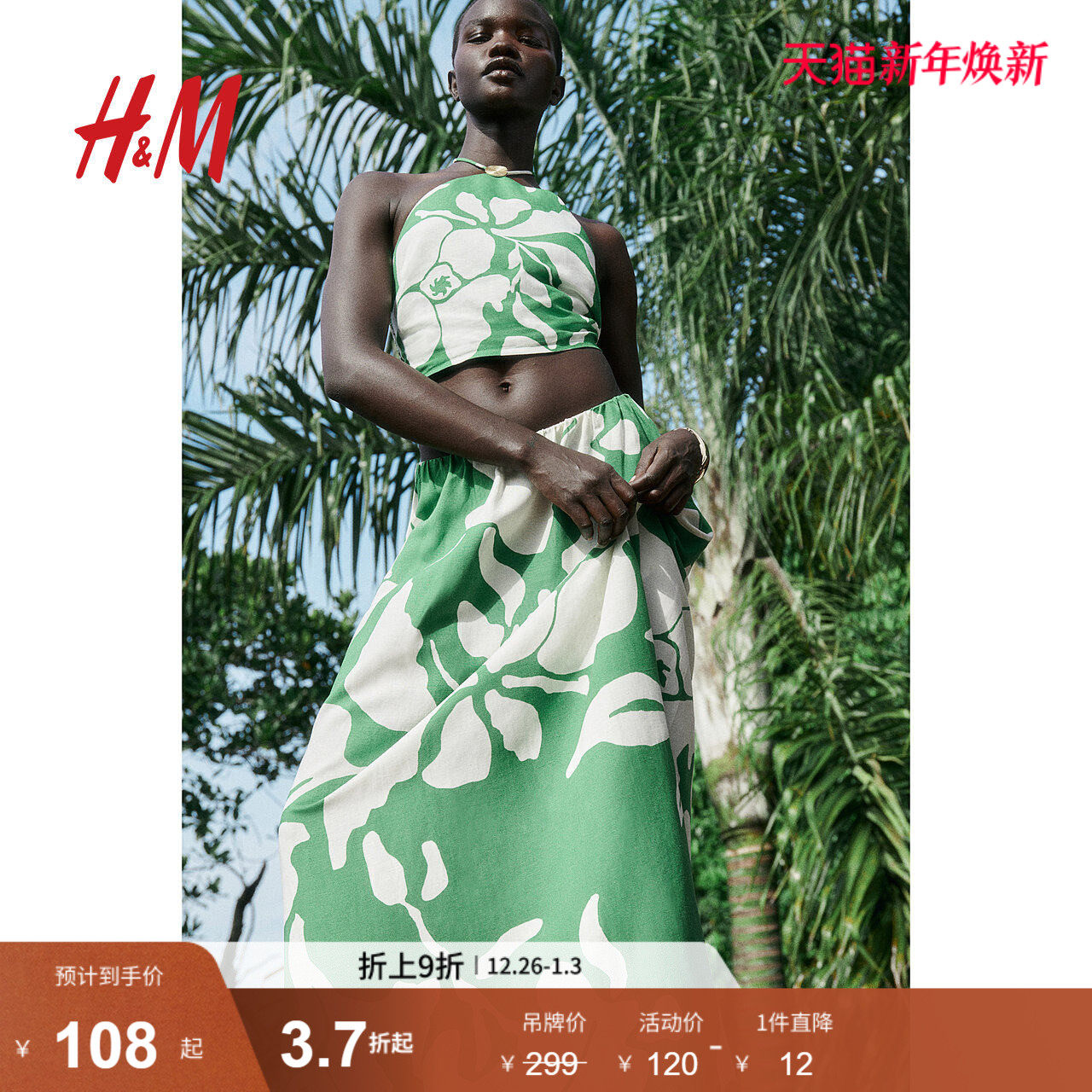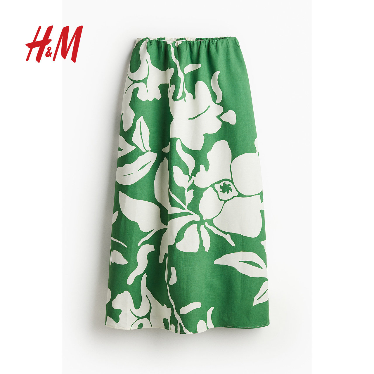 HM女装半身裙冬季亚麻混纺编织高腰透气度假风A字长裙1225776