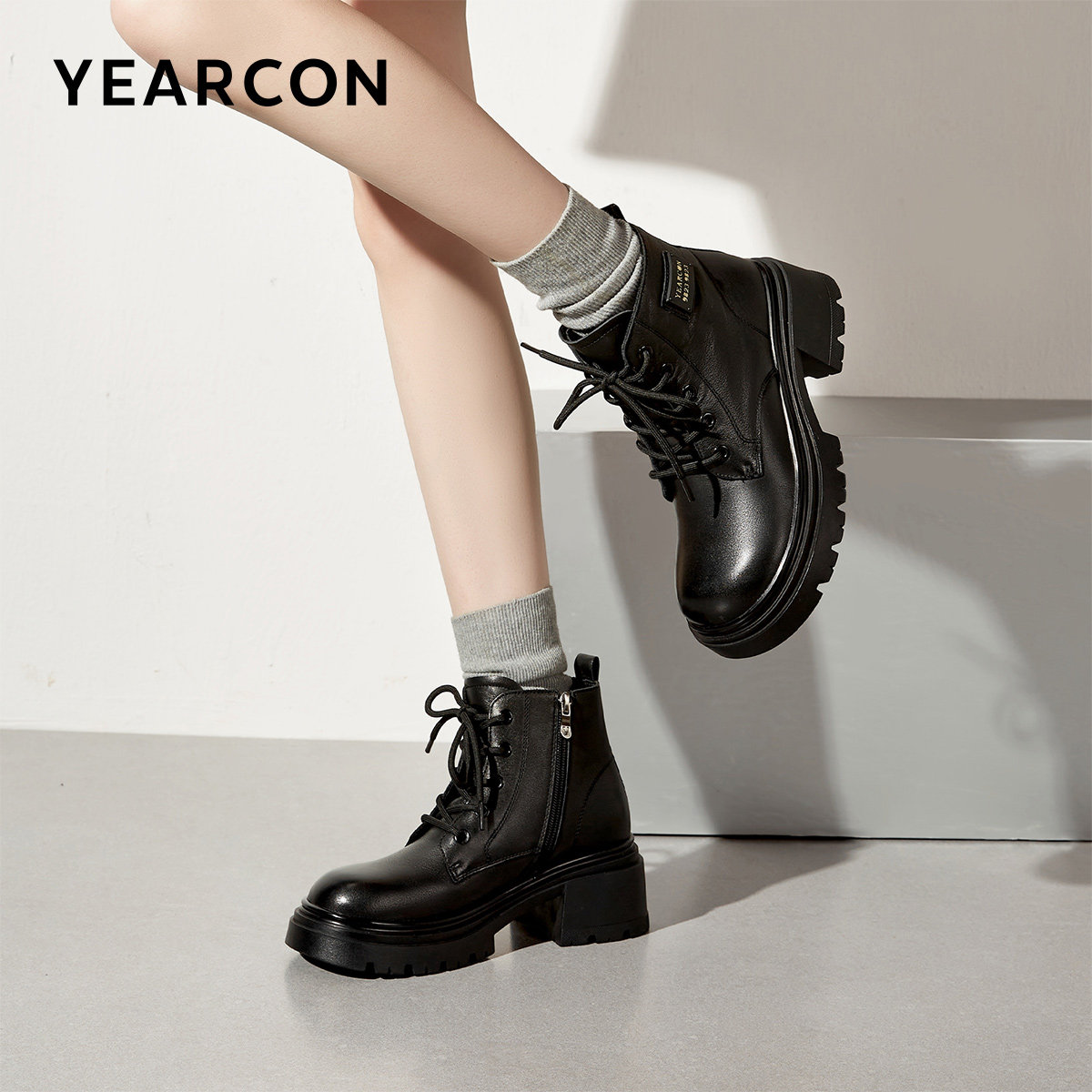 意尔康女鞋秋冬马丁靴高跟短靴真皮单靴英伦风厚底小个子显瘦