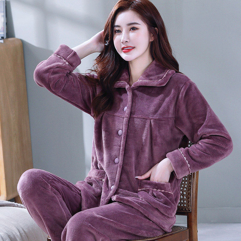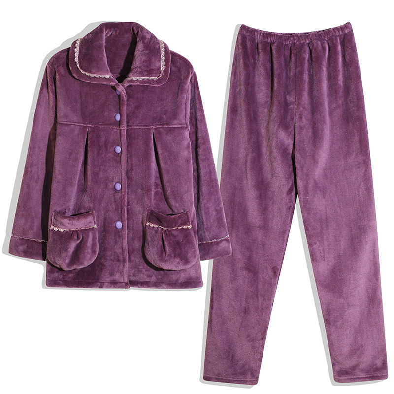 红豆中老年秋冬长袖保暖加厚珊瑚绒女士睡衣套装简约保暖法兰绒家