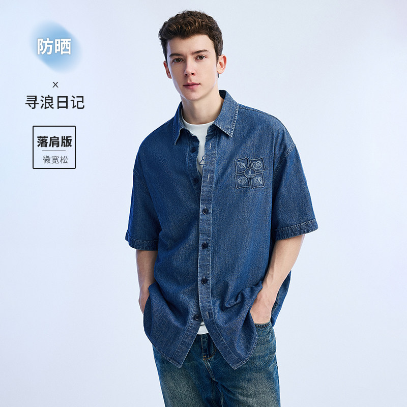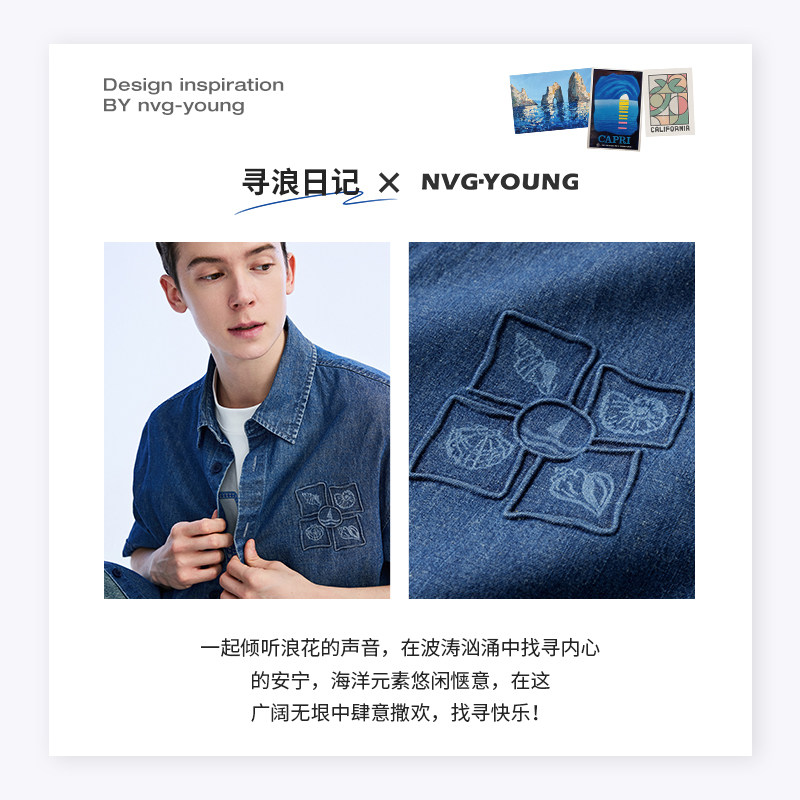 [张新成同款]Navigare小帆船蓝色防晒牛仔外套男2026夏季短袖衬衫