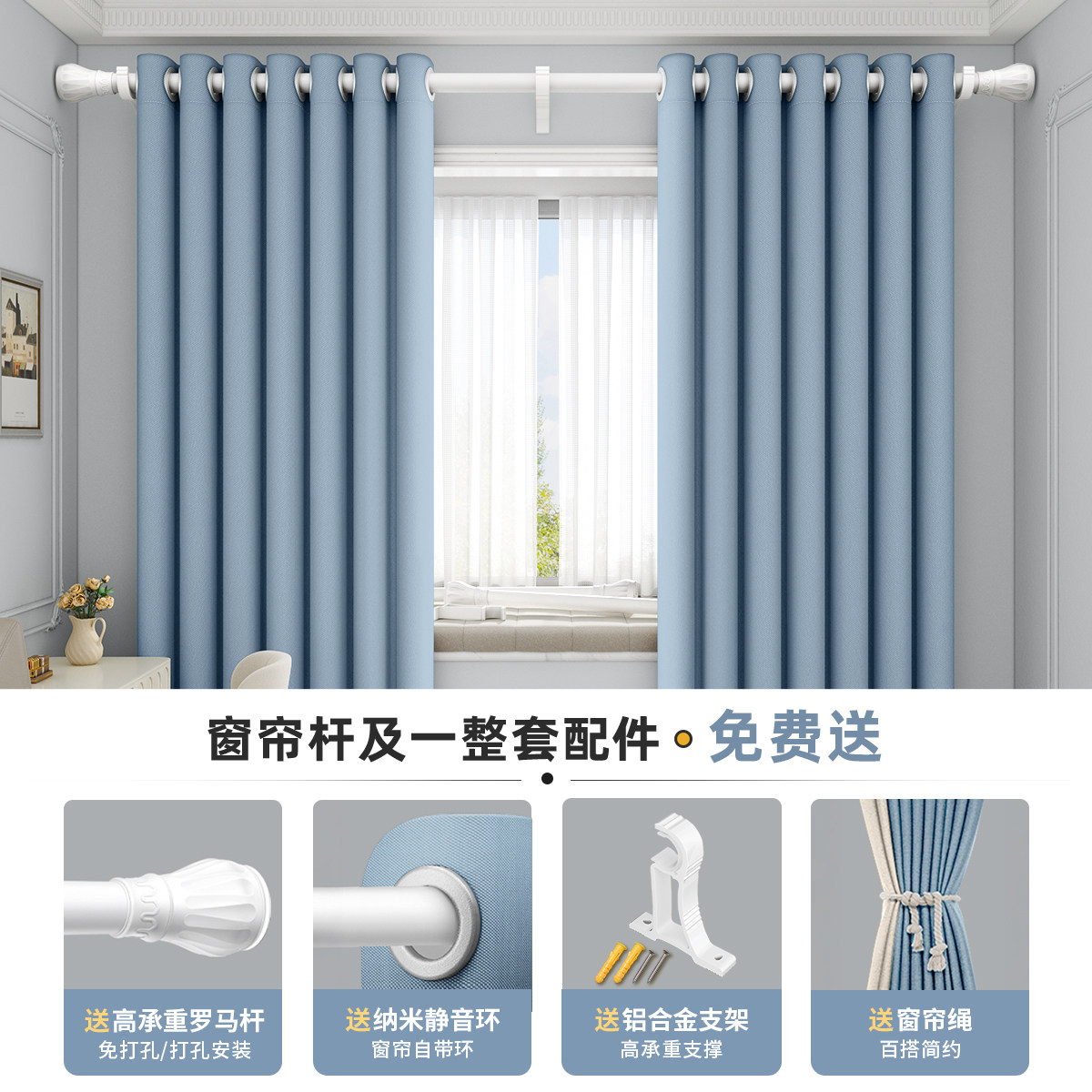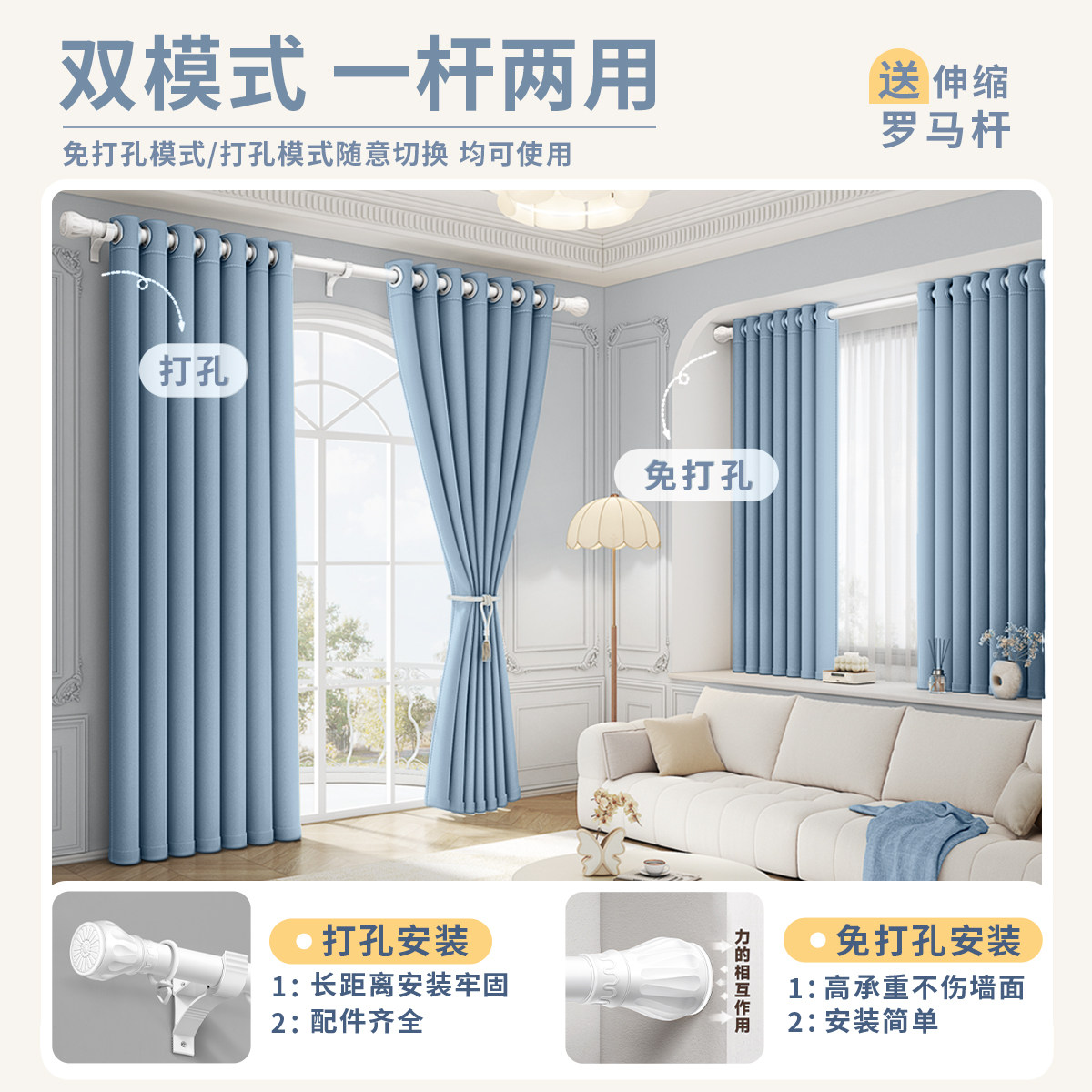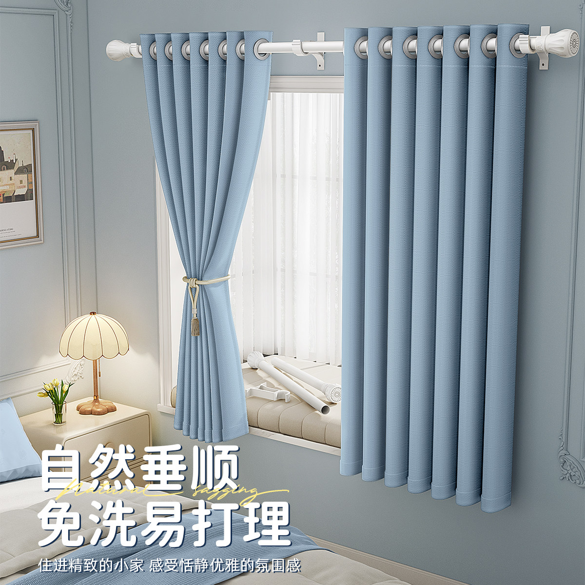 窗帘2025遮光一整套罗马杆新款免打孔安装卧室飘窗小窗户高级感布