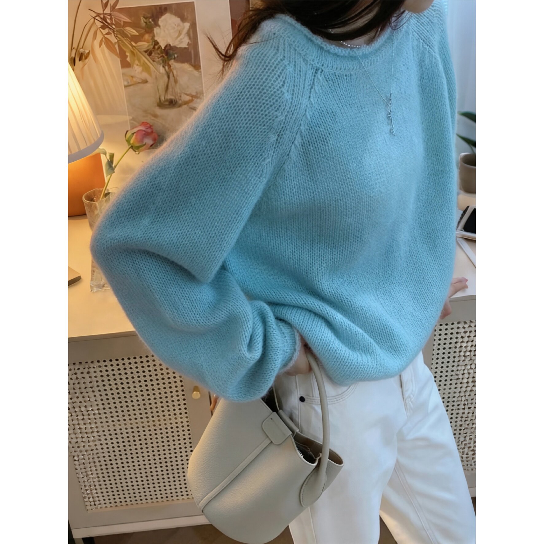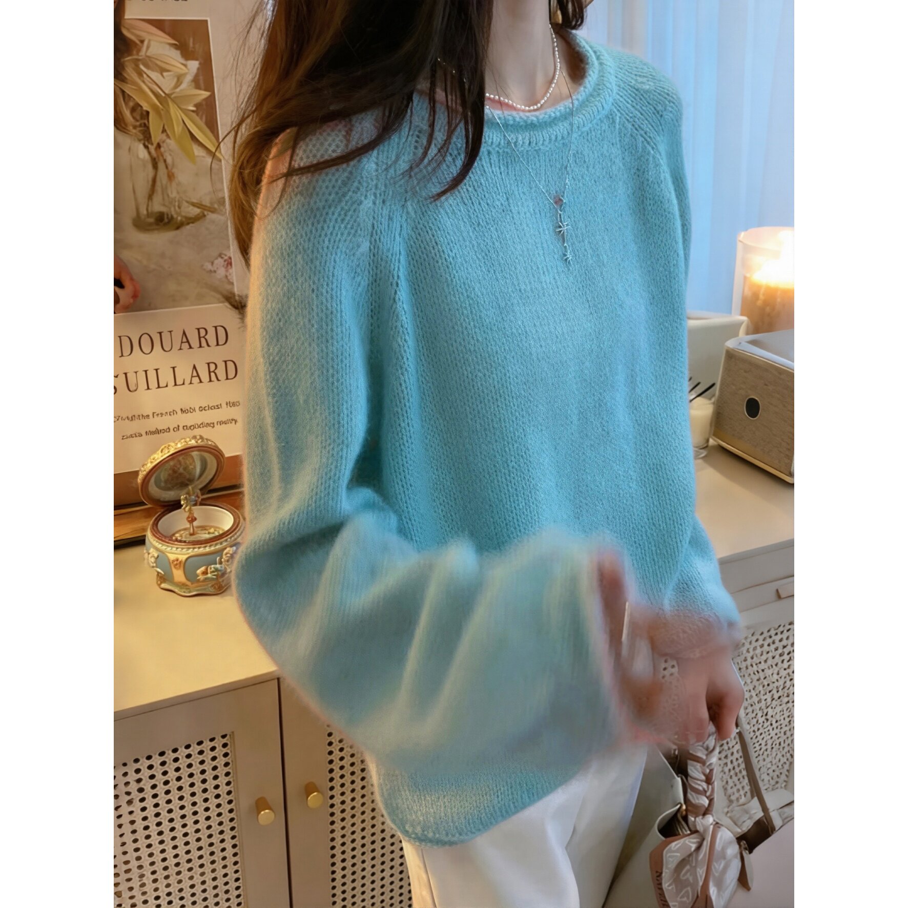 100%纯棉慵懒风圆领套头毛衣女宽松显瘦针织打底衫温柔风蓝色上衣