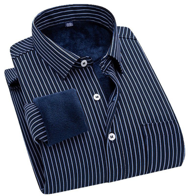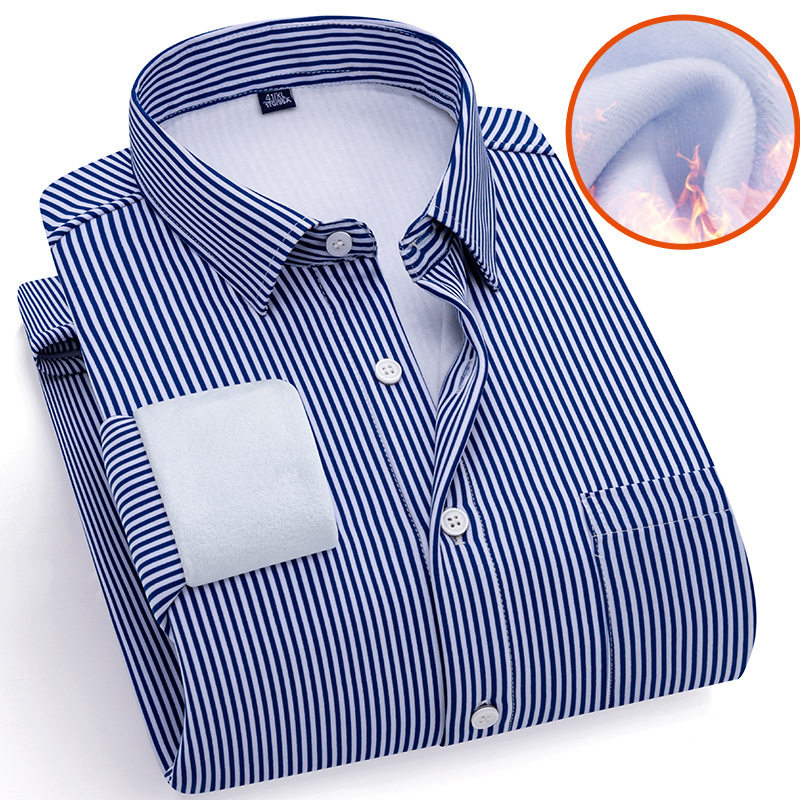 冬季保暖衬衫男蓝色条纹商务休闲长袖衬衣男加绒加厚爸爸装打底衫