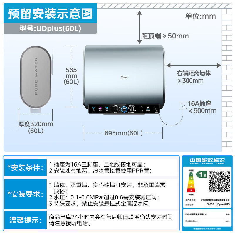 美的电热水器扁桶双胆速热家用洗澡卫生间60升80升大容量UDplus