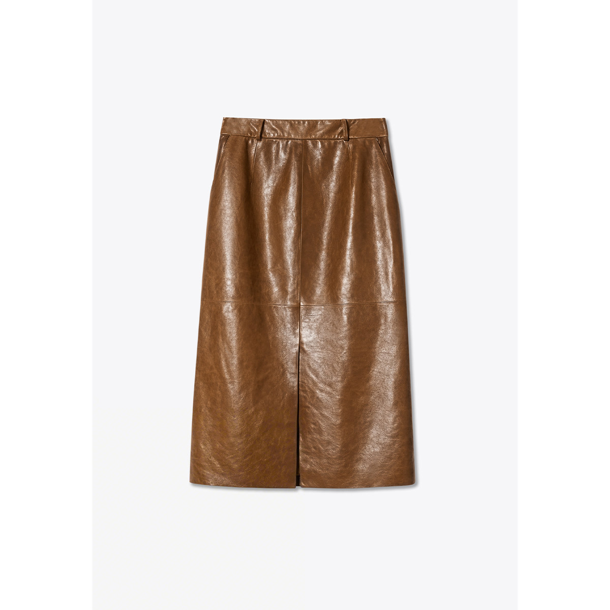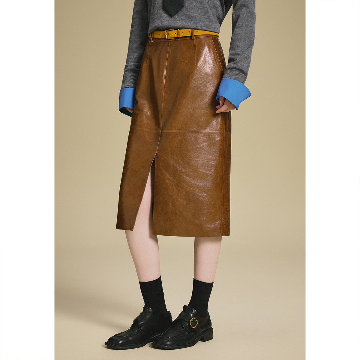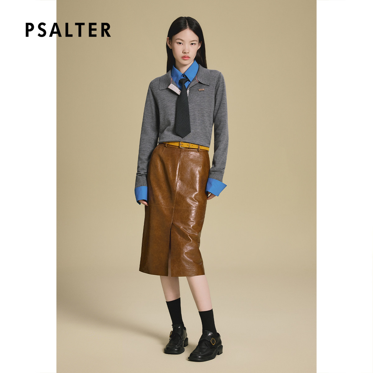 PSALTER诗篇油蜡绵羊皮高腰直筒开叉皮裙半身裙2025秋款