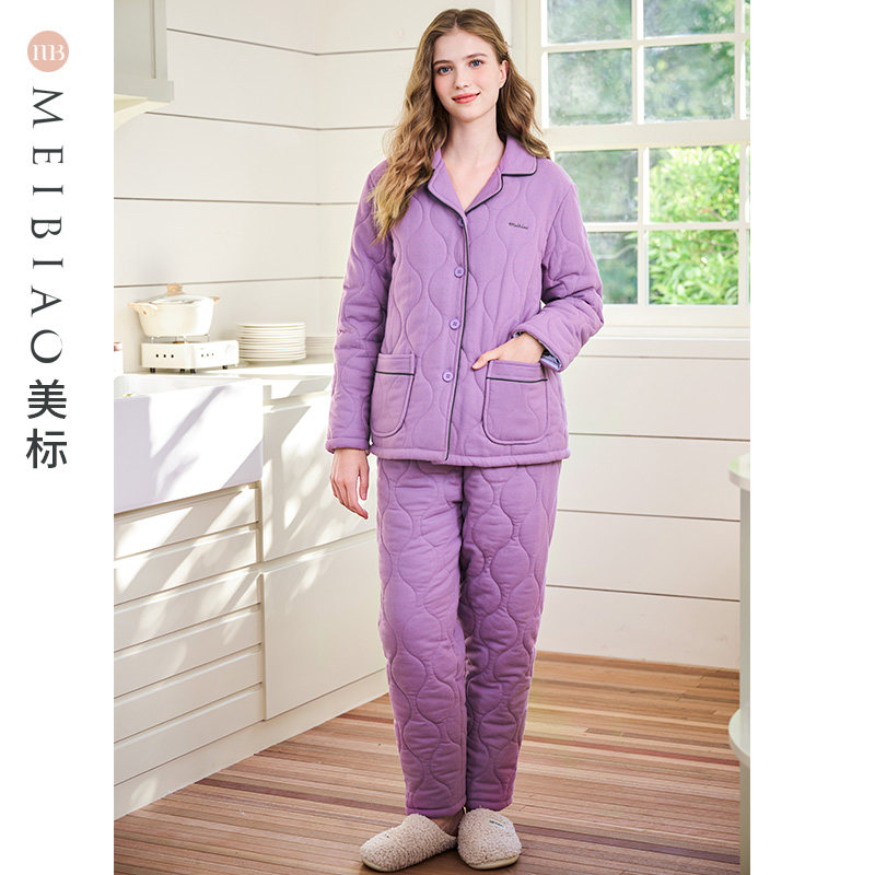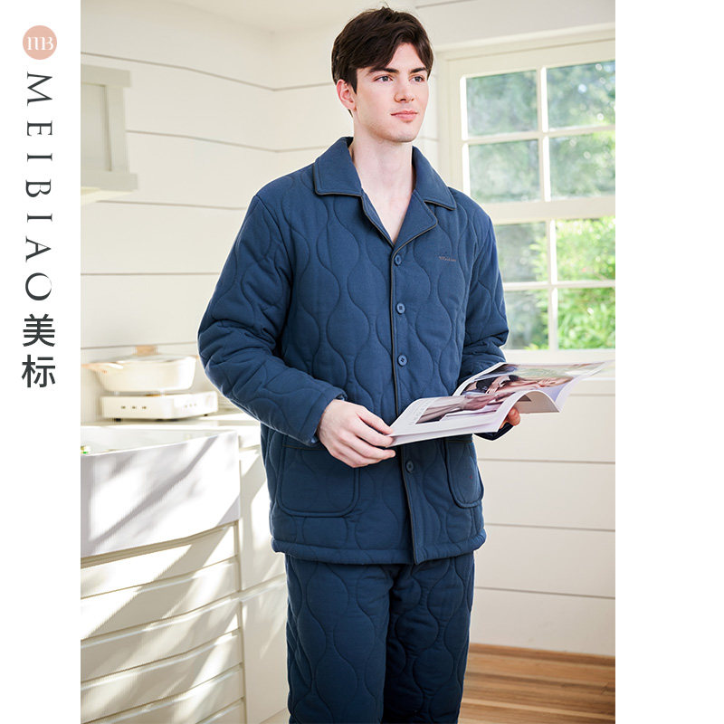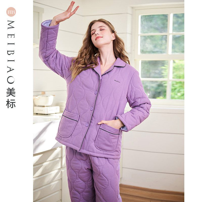 美标三层加厚保暖夹棉情侣睡衣套装女秋冬纯棉全棉可外穿家居服男