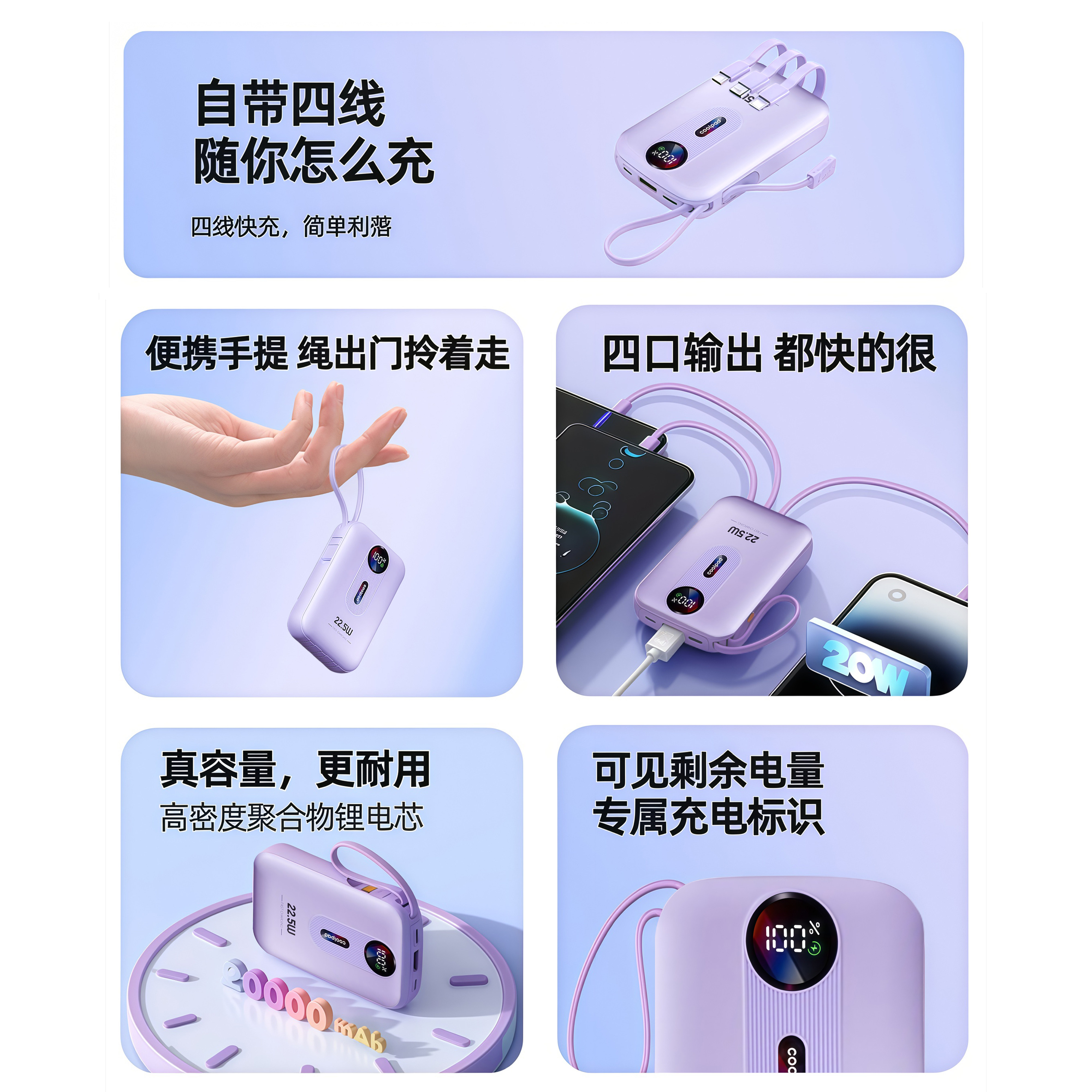 【3C认证可上飞机】酷派2026新款自带线充电宝20000毫安大容量超薄便携移动电源22.5W快充适用苹果17小米华为