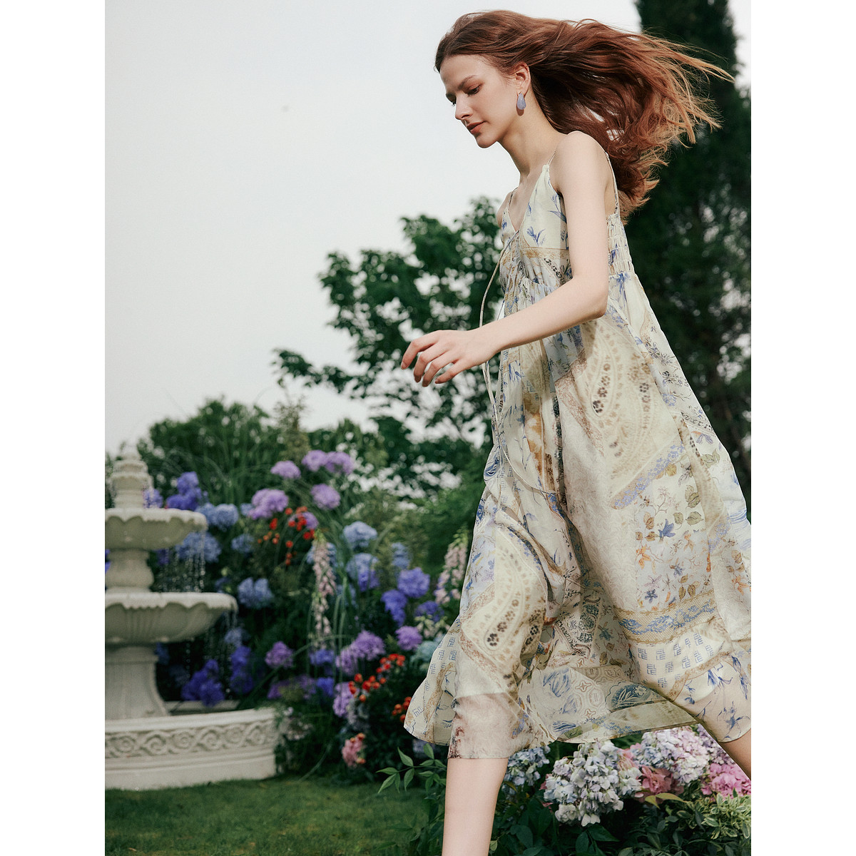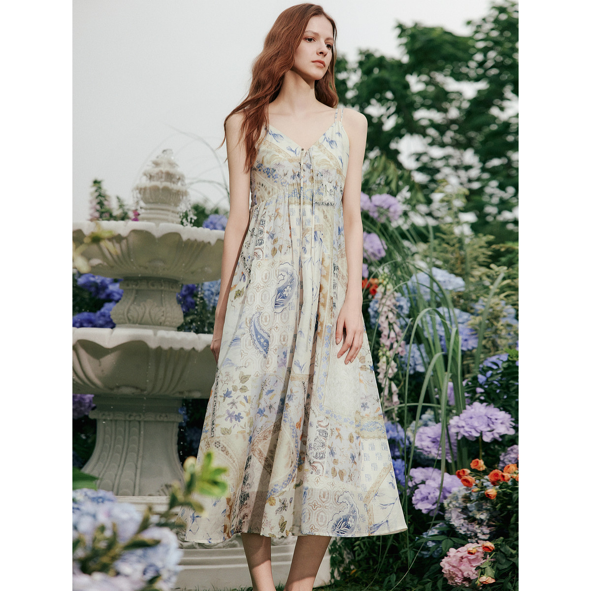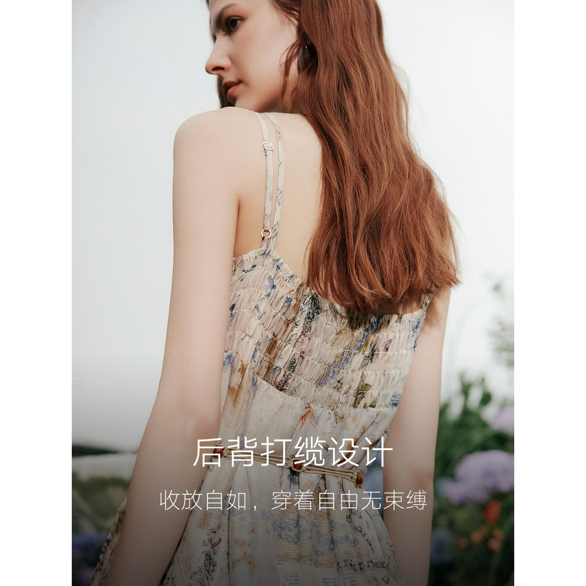 ELLE复古印花度假风吊带连衣裙女2025夏季新款时髦优雅波嬉a字裙