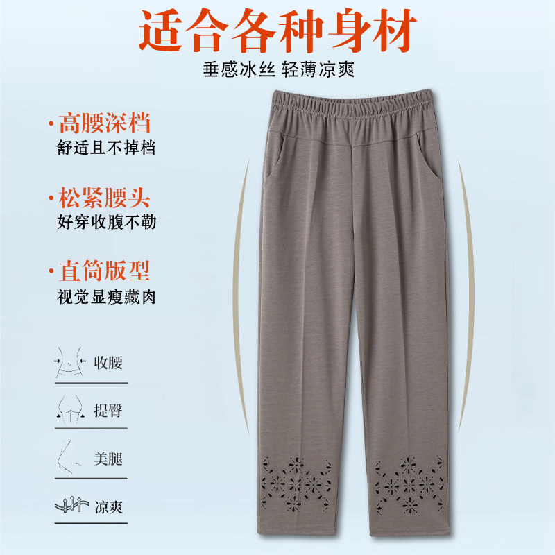 雅鹿妈妈裤子夏季天薄款冰丝九分裤中老年人女加肥大码宽松直筒裤