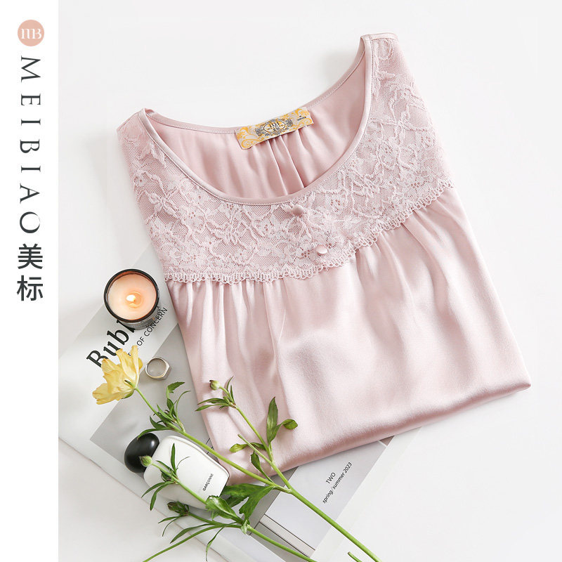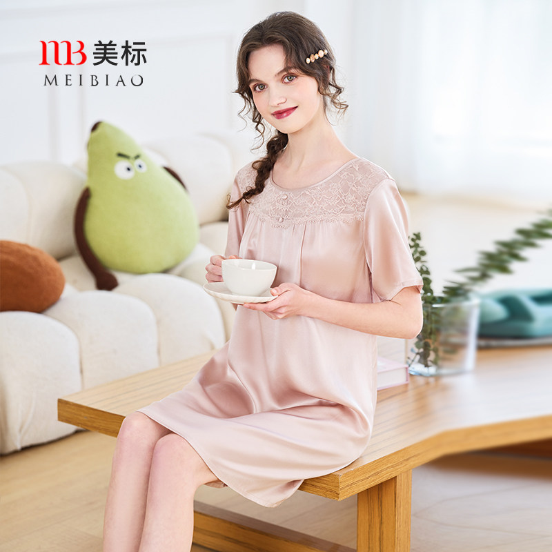 【断码清仓】美标重磅短袖真丝睡裙女夏桑蚕丝家居服丝绸蕾丝睡衣