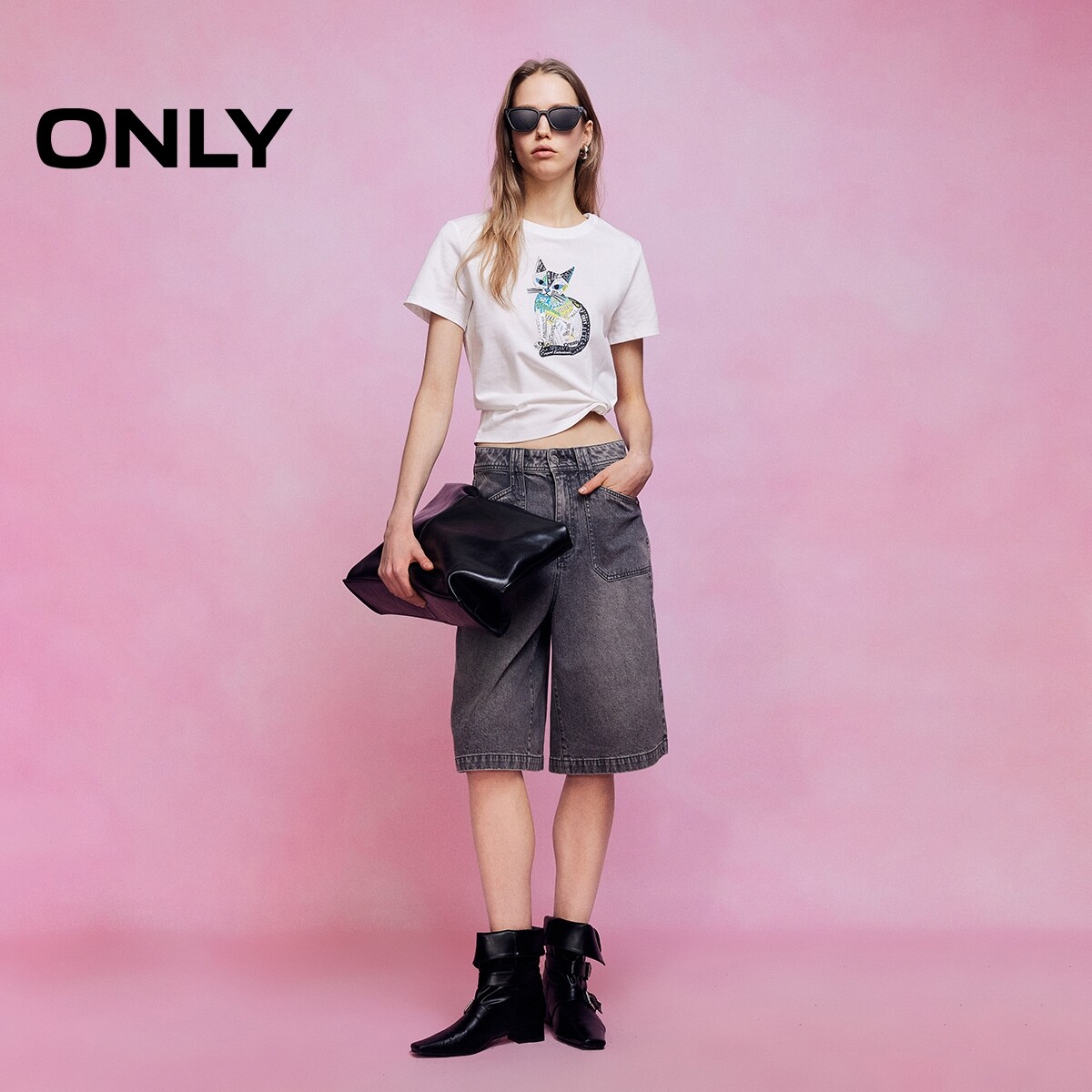 ONLY2026春季新款艺术拼贴小猫印花圆领纯棉正肩显瘦短袖T恤女