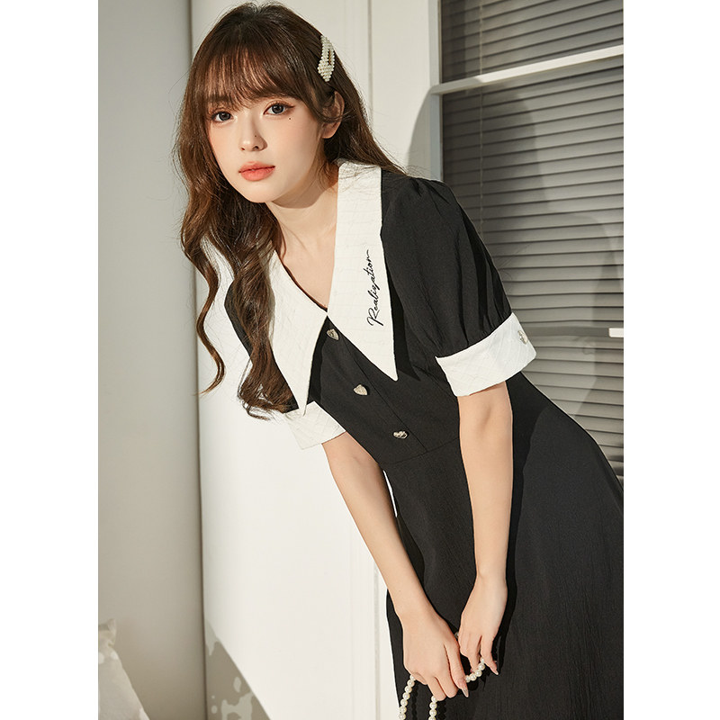 唐狮法式连衣裙女泡泡袖尖领设计夏季赫本风小黑裙收腰短袖连衣裙