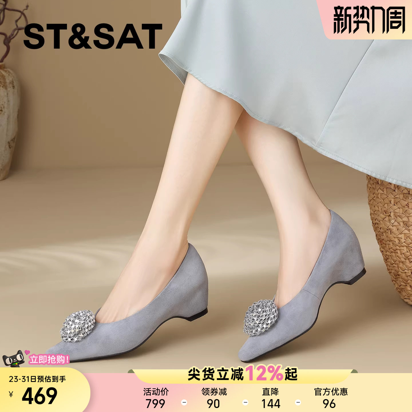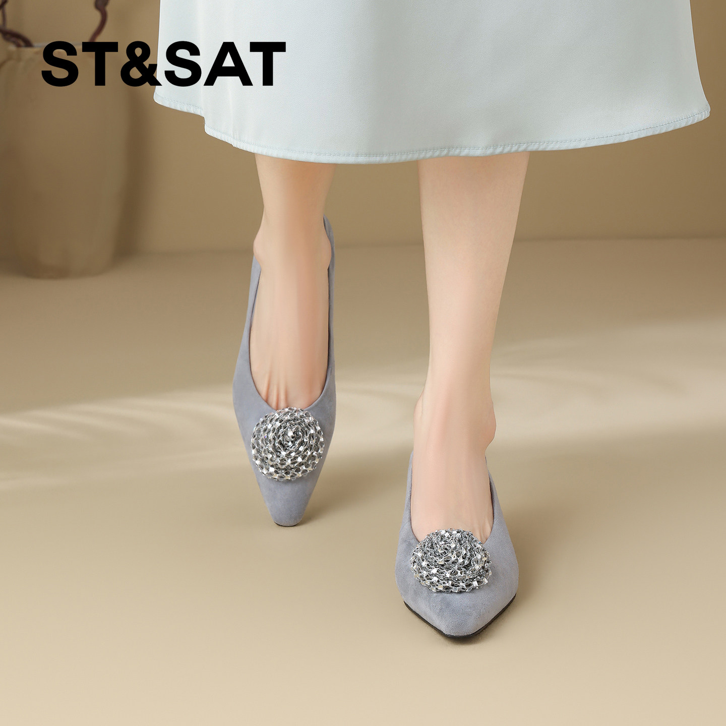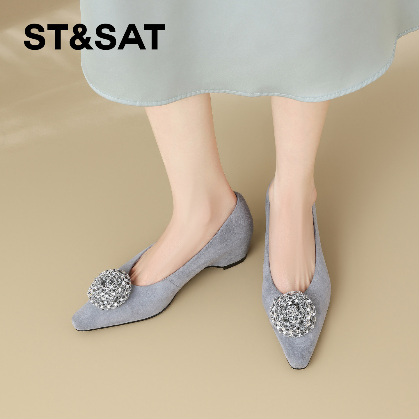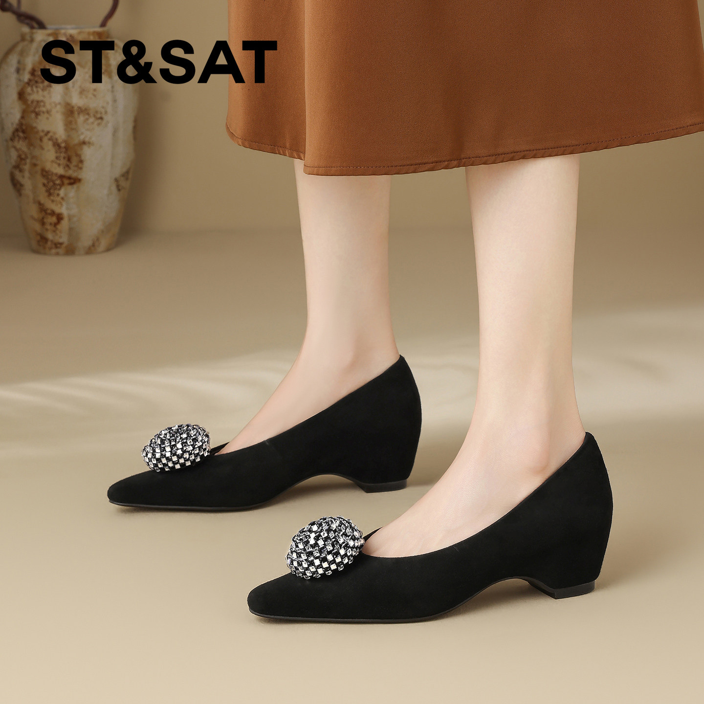 星期六真皮立体镶钻装饰时装鞋女2026年春季新款方头坡跟浅口单鞋