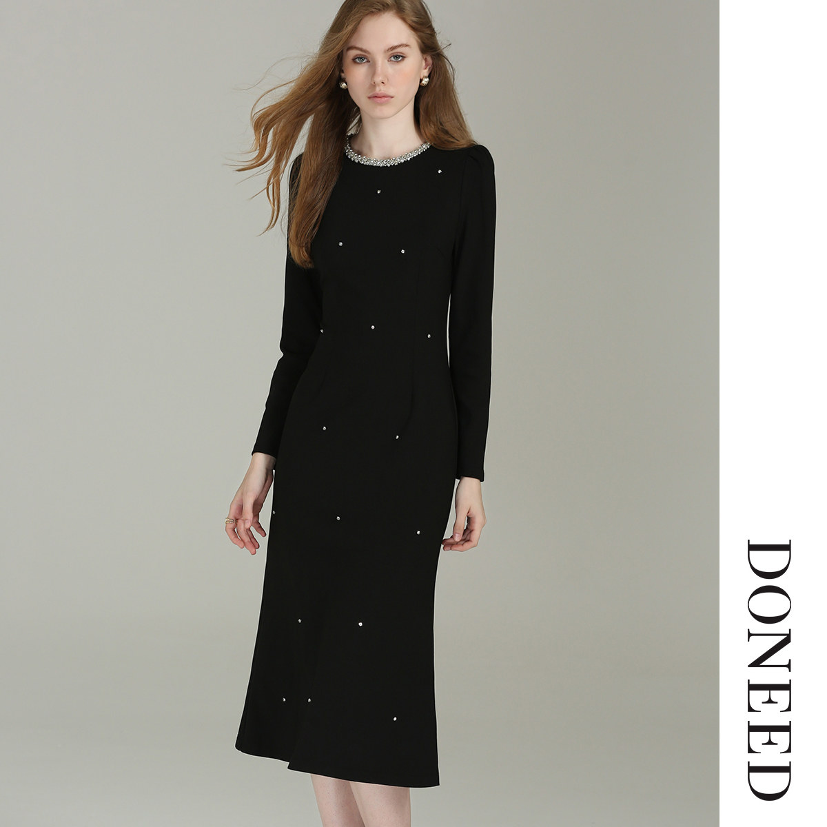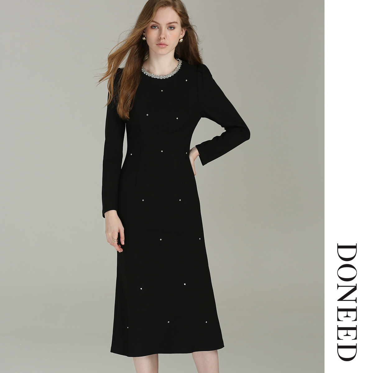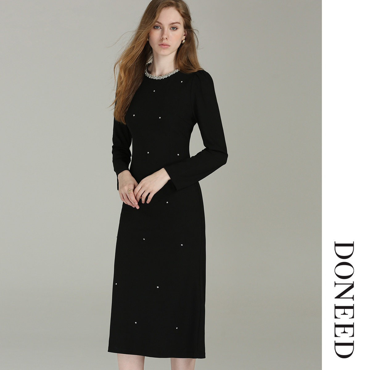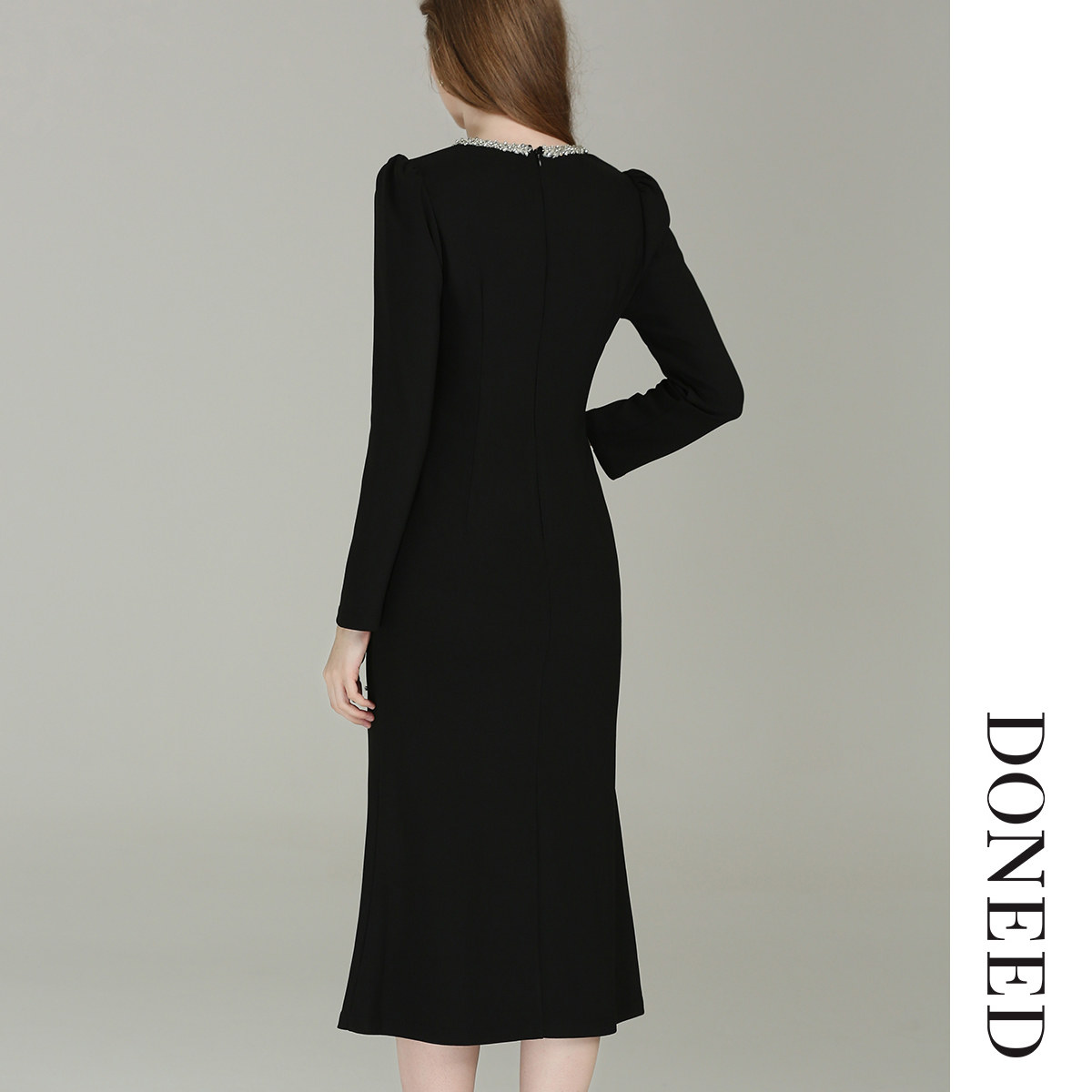 DONEED2025春新款时尚优雅修身钉珠圆领泡泡长袖通勤长裙连衣裙女