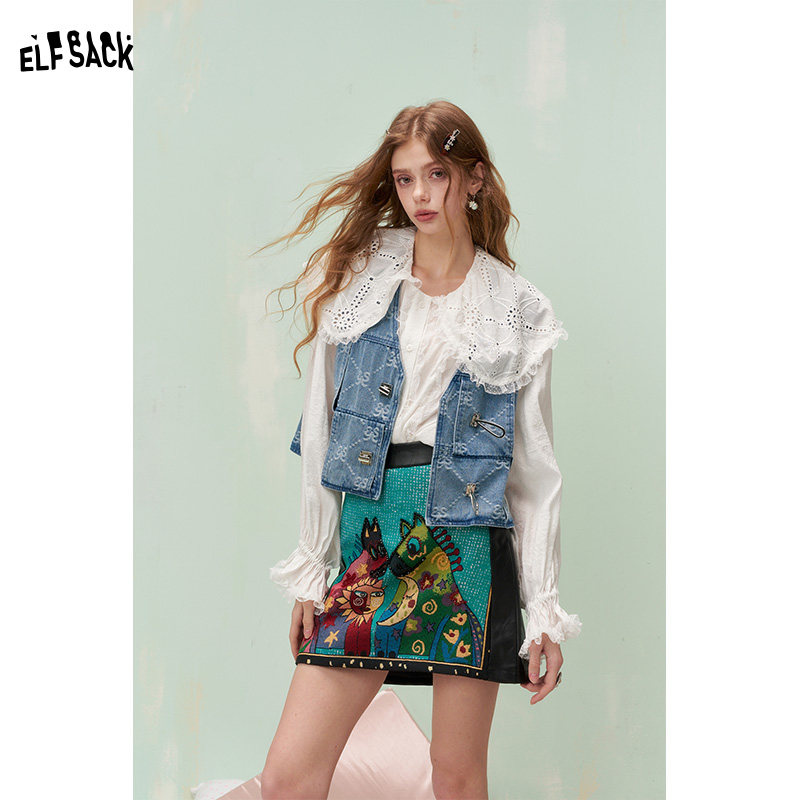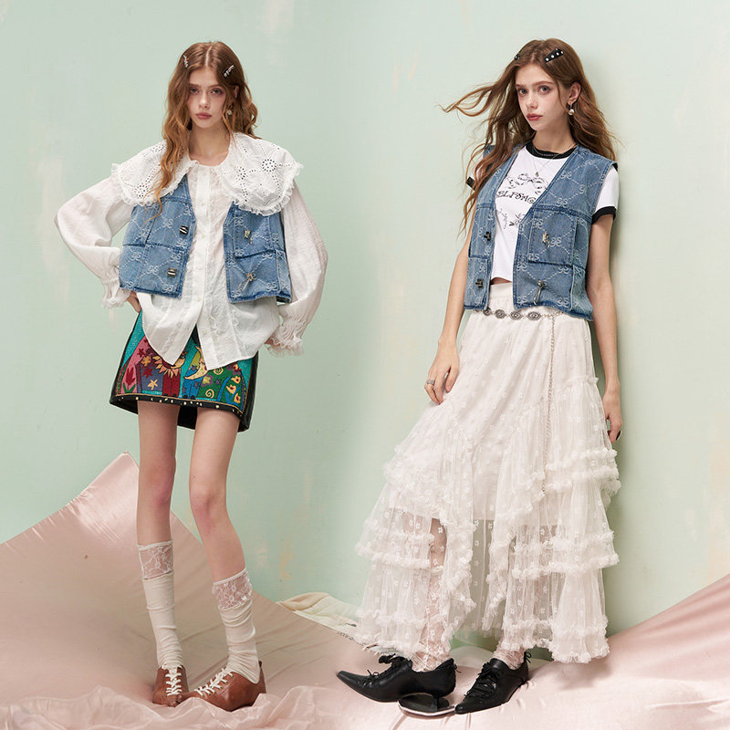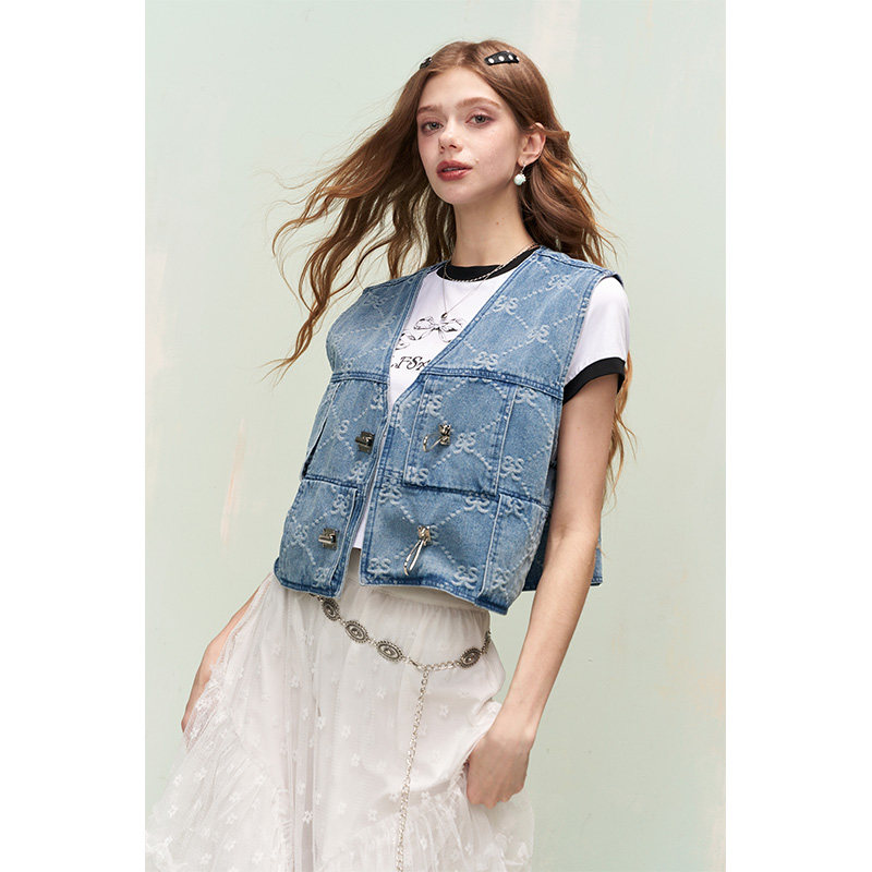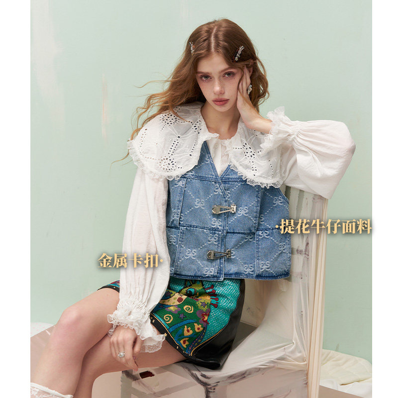 妖精的口袋原创提花牛仔马甲女2026年早春新款老钱风复古潮酷背心