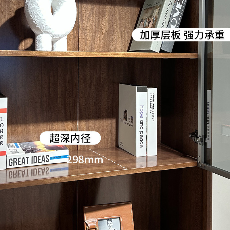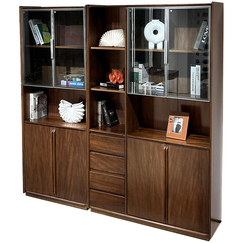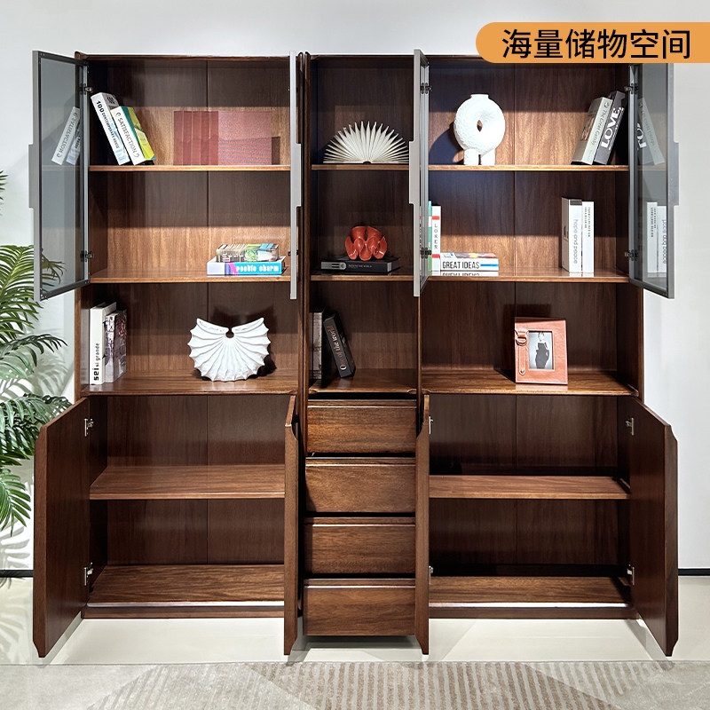 现代简约全实木书柜书房客厅家用胡桃木储物组合柜带玻璃门展示柜